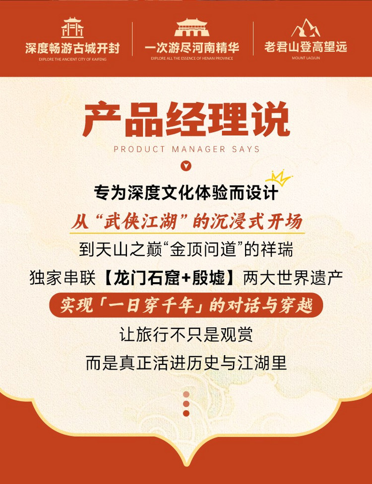 ·【开封】八朝古都,北宋都城 “汴京”,以宋文化为核心,兼具历史厚重感与市井烟火气,特色是 “一河两街三秀”:汴河、宋都御街 / 书店街、实景演出秀、非遗秀、民俗秀。