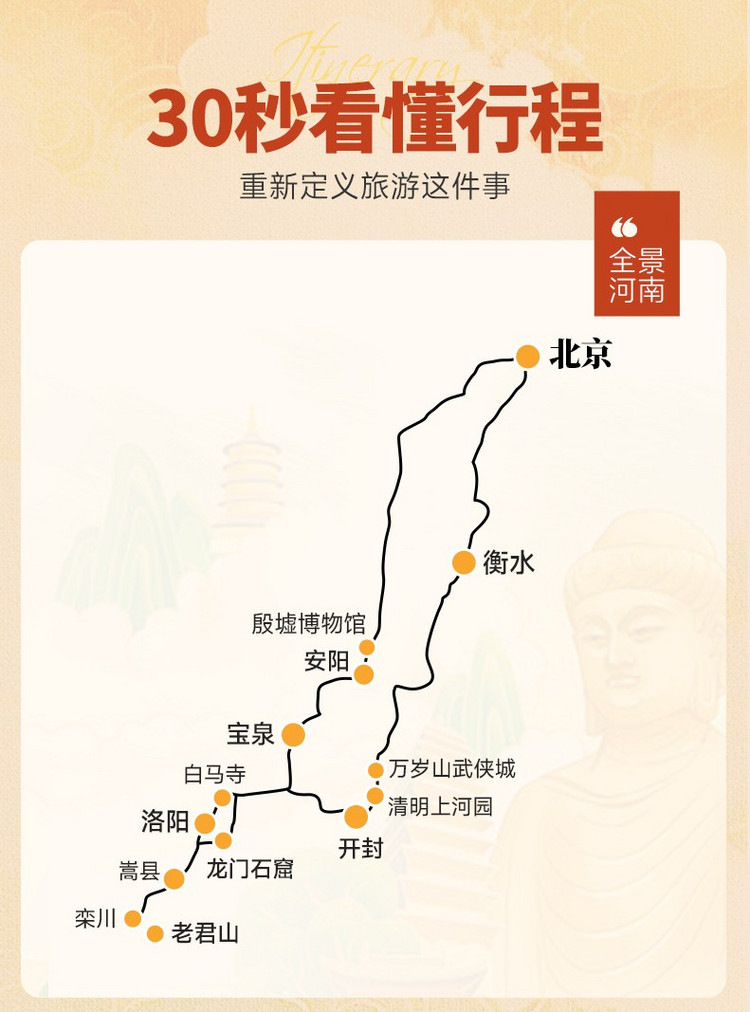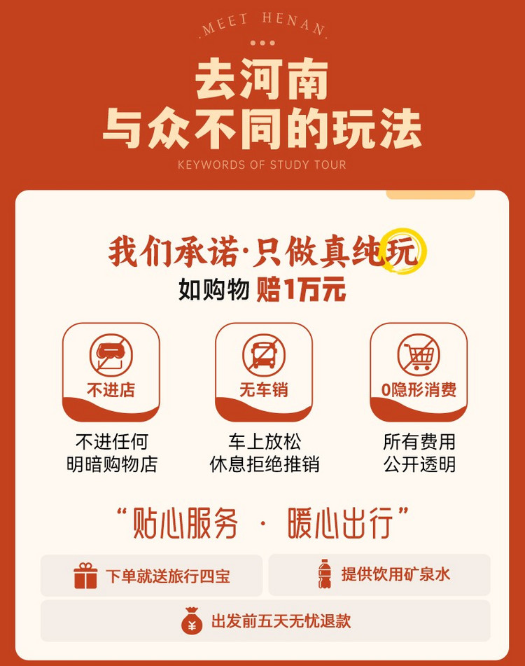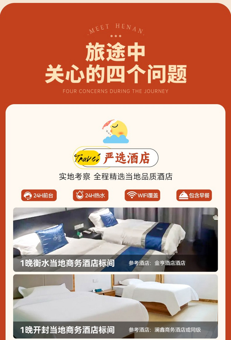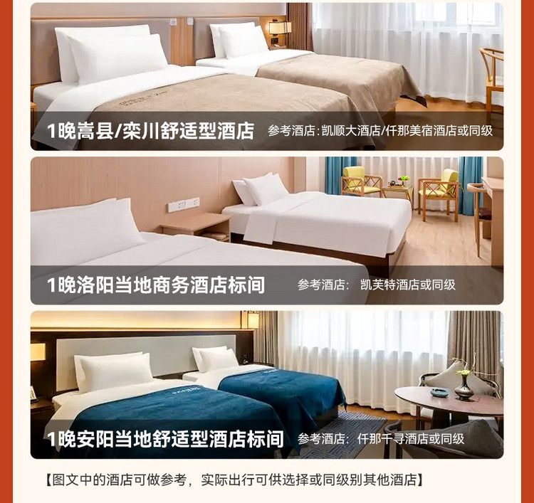 2、门票:万岁山武侠城100、清明上河园120、龙门石窟90元、老君山100元、白马寺35元、宝泉套票190元(含双景区门票+索道+摆渡车)、殷墟博物馆80元;(以上价格供参考,优惠证件有效,均可自愿选择购买,如价格有变动,以景区实际执行为准);