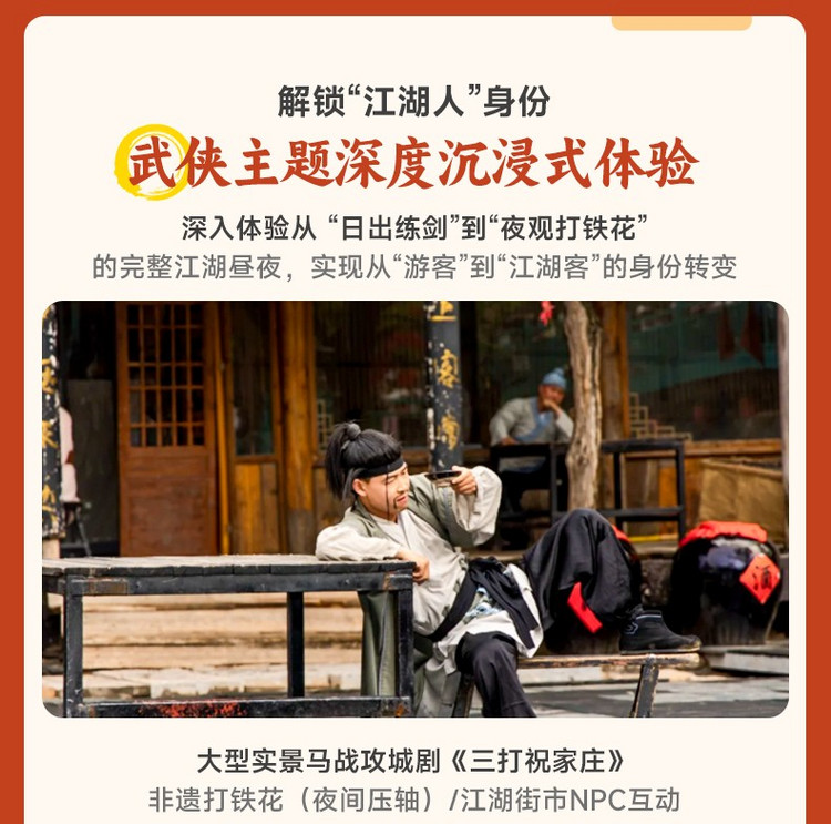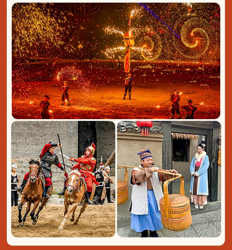 推荐演出:《三打祝家庄》《沙场打铁花》《神舟传奇》《江湖绝技》、NPC互动等(部分演出需要预约,演出以官方公告安排为准);