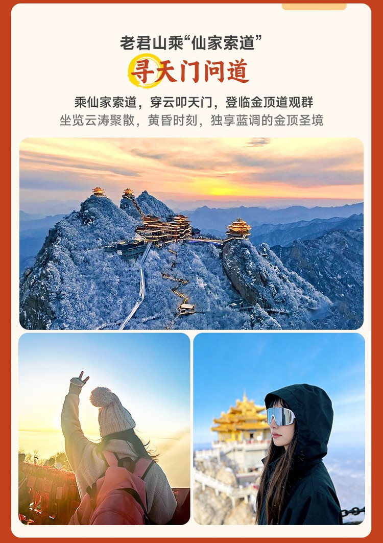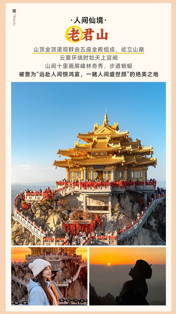 ·【老君山】因传说中老子归隐修炼而得名,被誉为 “天下无双圣境,世界第一仙山”。属伏牛山主峰,海拔 2217 米,以花岗岩峰林地貌和道教文化为核心特色,有 “北方张家界” 之称。四季皆有绝景:春赏杜鹃、夏避酷暑、秋观云海、冬览雾凇,是中原地区最受欢迎的山岳型景区之一。