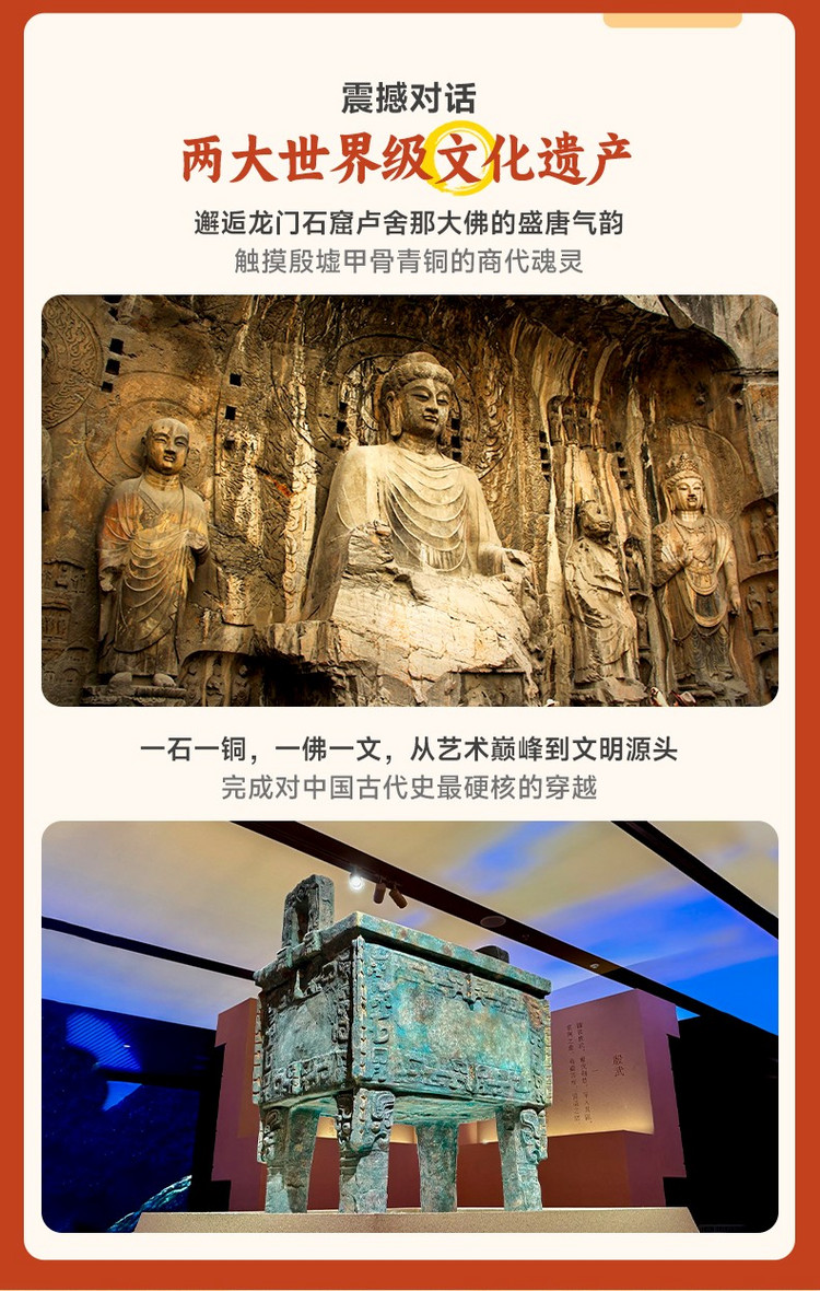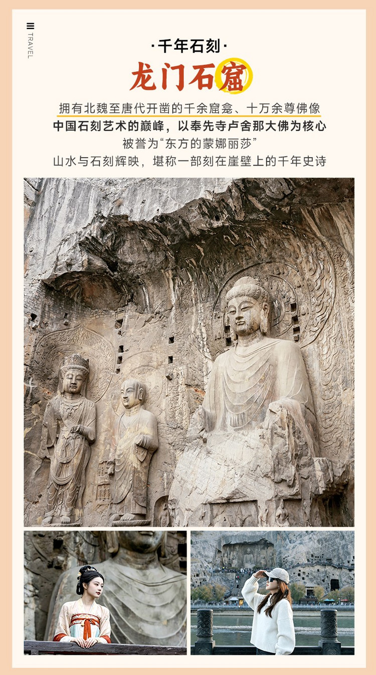 ·【龙门石窟】与敦煌莫高窟、云冈石窟、麦积山石窟并称中国四大石窟,被联合国教科文组织评价为 “中国石刻艺术的最高峰”。始凿于北魏孝文帝迁都洛阳(公元 493 年),历经东魏、西魏、北齐、隋、唐、五代、宋等朝代连续大规模营造达400 余年,南北长约 1 公里,现存窟龛 2345 个、造像 10 万余尊、碑刻题记 2800 余品,是世界上造像最多、规模最大的石刻艺术宝库。