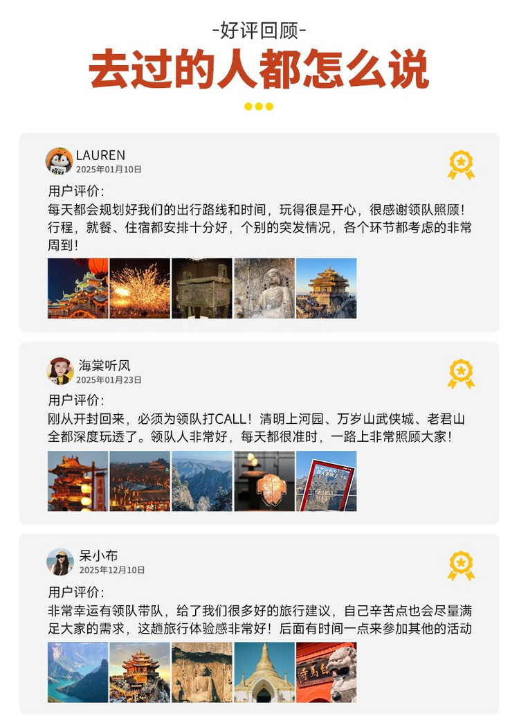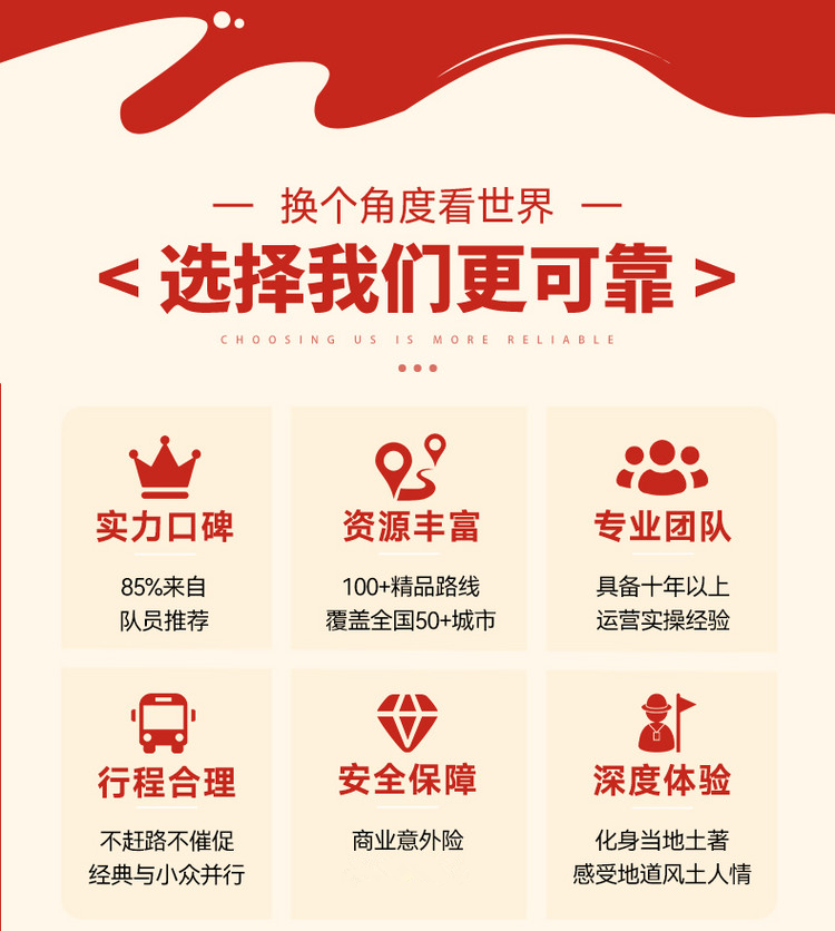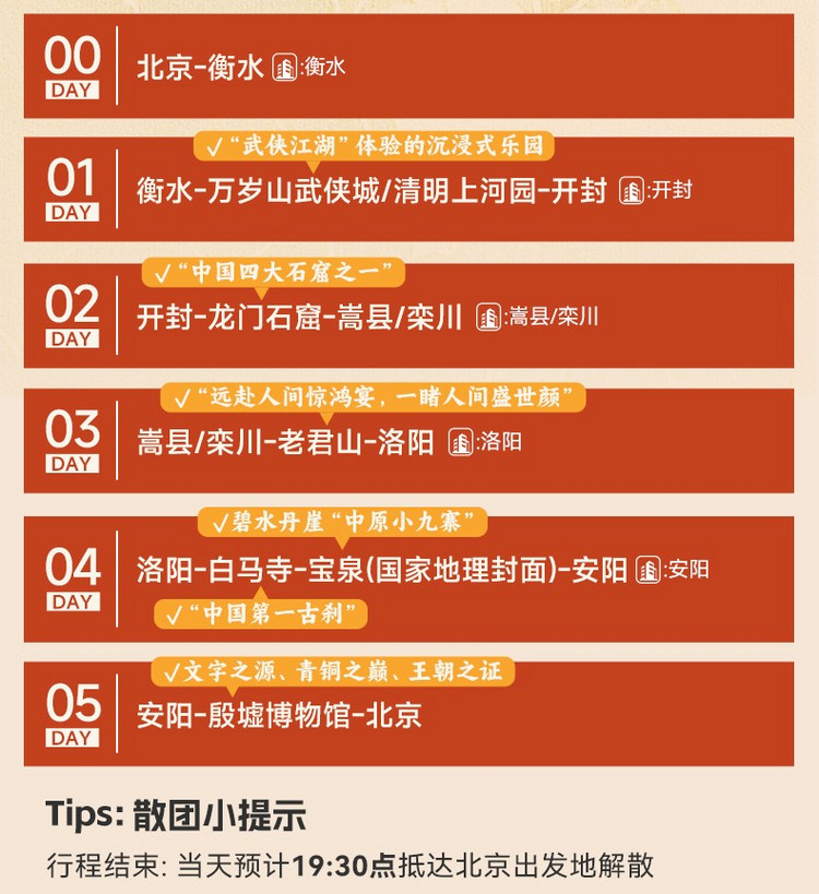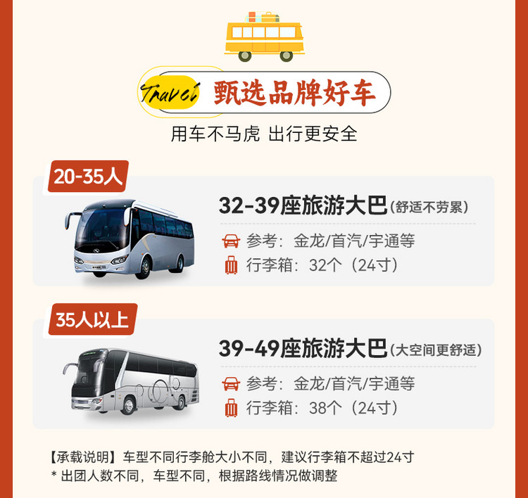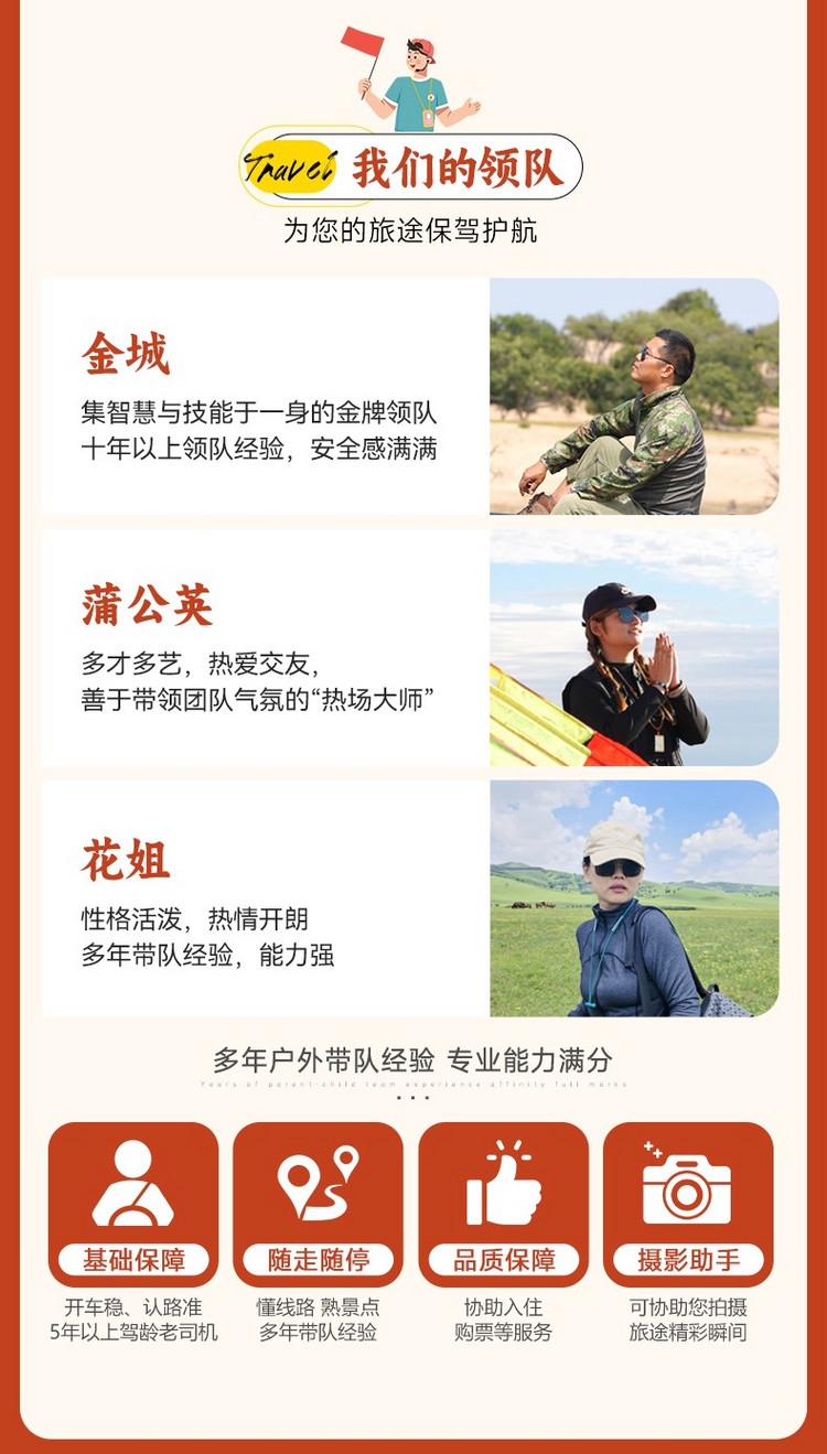 注:以上时间为正常安排时间,参与者体力不同,耗时可能会有差距。如遇天气、道路堵车、景区管控等外在因素影响,以领队安排为准。