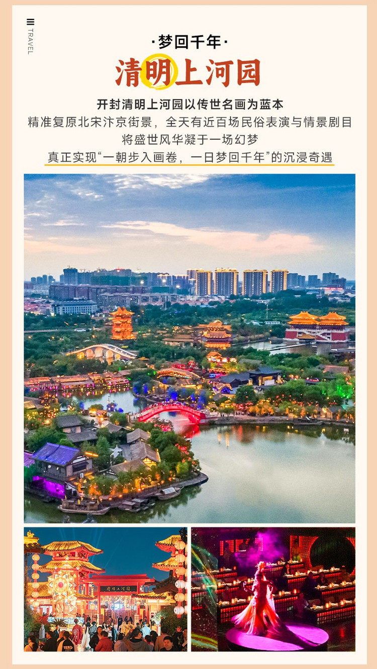 ·【清明上河园】以北宋画家张择端《清明上河图》为蓝本1:1 复原的大型宋文化主题公园,占地600 余亩(水面 180 亩),拥有400 余间仿宋房屋、50 多艘古船,是中原最大仿宋古建筑群。特色是 “活起来的《清明上河图》”工作人员身着宋装,每日上演60 + 场实景演出,打造沉浸式北宋市井生活体验。