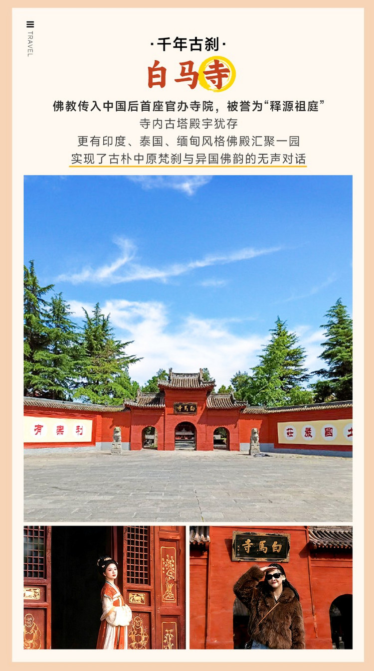 ·【白马寺】是佛教传入中国的发源地,东汉永平七年,汉明帝夜梦金人,派使西行求法;永平十一年,天竺高僧摄摩腾、竺法兰以白马驮载佛经佛像抵洛,明帝敕建寺院,因白马驮经之功得名 “白马寺”。