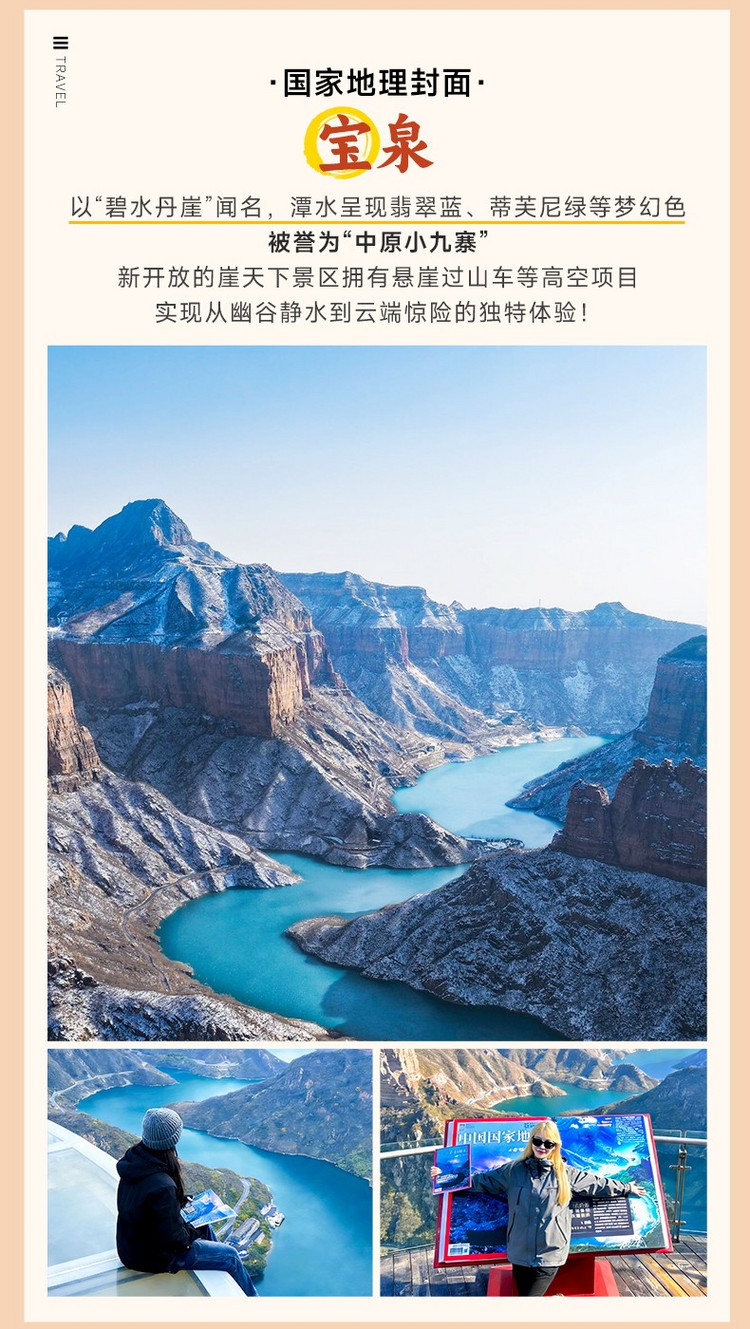 ·【宝泉旅游区】国家 5A 级景区,由大峡谷与崖天下两大园区组成,被誉为 “中原小九寨”。“懒人友好型” 景区 ,设计上最大化减少爬山需求,同时提供丰富的游玩体验。大峡谷以平路为主,崖天下以 “上索下梯” 为主,都无需高强度爬山。
