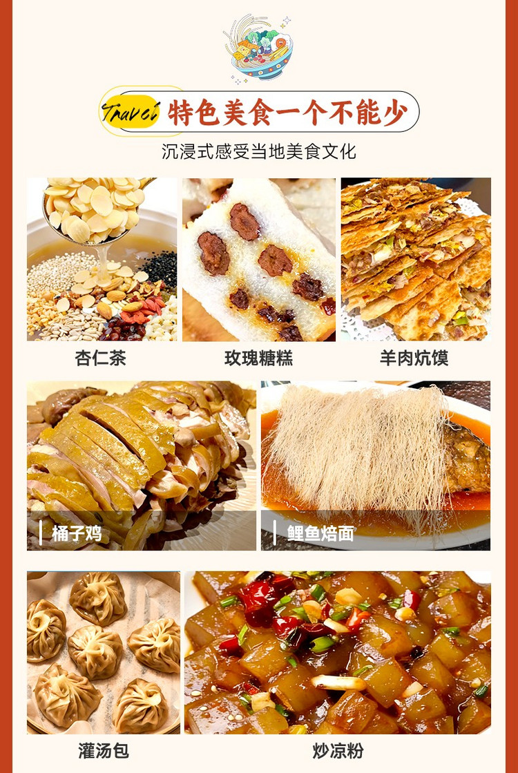 特色小吃:灌汤包、桶子鸡、炒凉粉、杏仁茶、花生糕