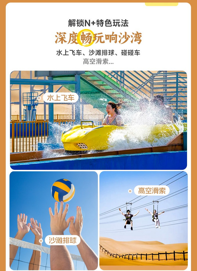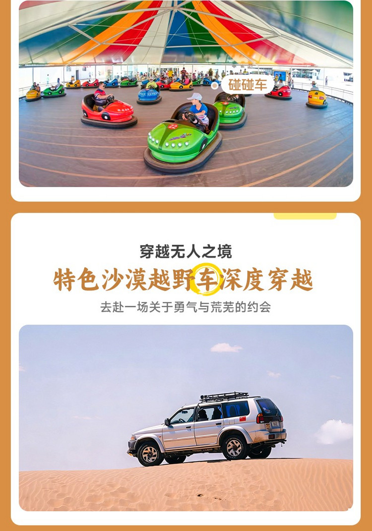 2、娱乐:景区内单独收费的娱乐项目等,如:仙沙岛/悦沙岛娱乐+骑骆驼+沙海游艇套票,260/人;