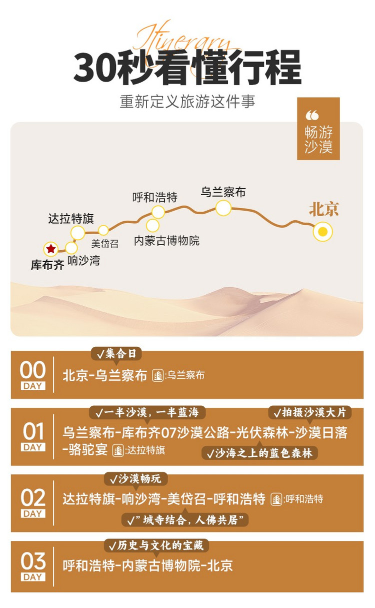 4、门票:响沙湾景区门票+往返索道、美岱召首道门票;