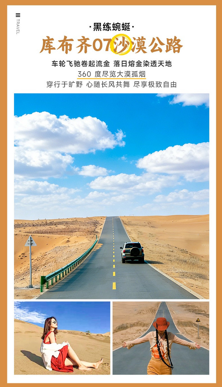 ·【库布齐 07 沙漠公路】一条穿越中国第七大沙漠的黑色缎带,被誉为 "沙海天路"。原生态沙漠路线,以其金色沙丘与绿色治沙工程的完美融合,黑色柏油路如绸带蜿蜒于金色沙丘之间,起伏的地势使其从高处俯瞰形似阿拉伯数字 "7",这也是 "07" 名称的由来。