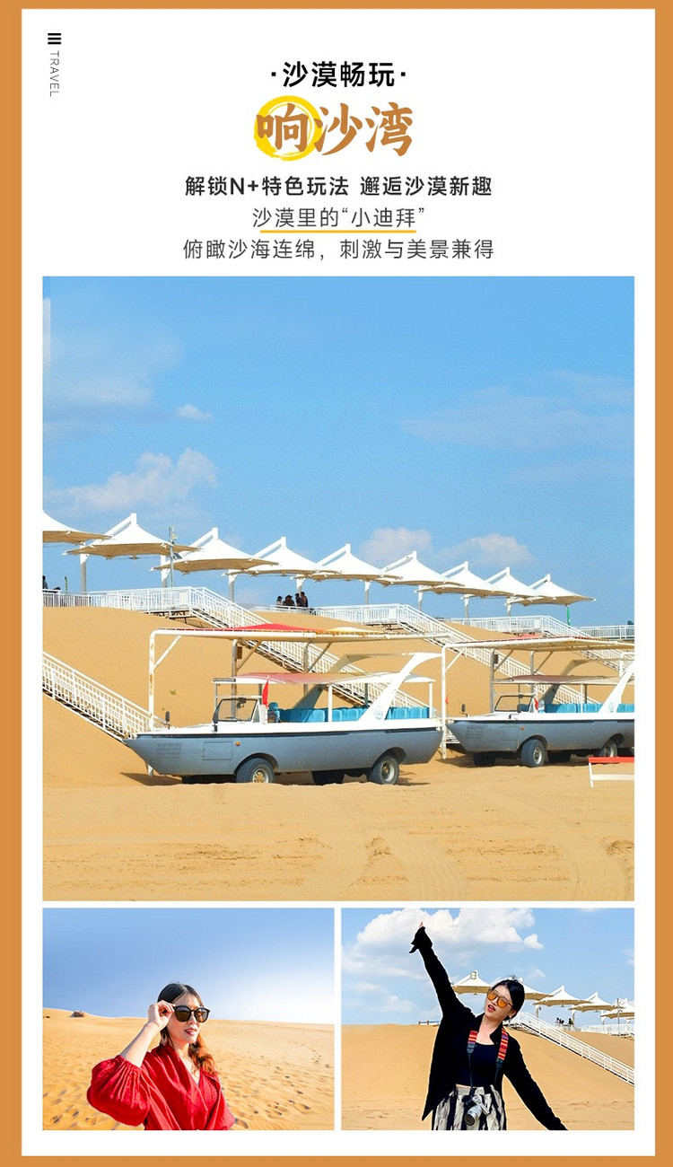 我们早上进入景区,避开客流高峰,留有足够的时间在响沙湾游玩。乘坐跨沙索道进入沙漠深处游玩拍照,您还可以自愿选择去两岛体验大漠风情。