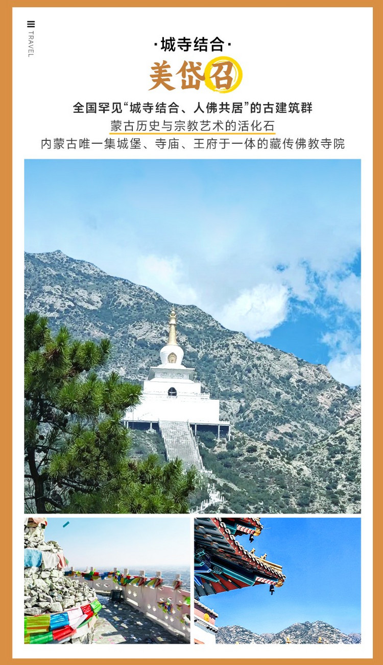 ·【美岱召】原名灵觉寺,后改寿灵寺,是内蒙古地区重要藏传佛教建筑之一,全国重点文物保护单位。美岱召依山傍水,在建筑上更有独特的风格,它是仿中原汉式,融合蒙藏风格而建,是一座“城寺结合,人佛共居”的喇嘛庙,四角筑有外伸约11米的墩台,上有角楼,寺周围筑有围墙,土筑石块包砌,平面呈长方形,周长681米,总面积约4000平方米。寺内有大量的壁画,如大雄宝殿内释迦牟尼历史壁画及描绘蒙古贵族拜佛的场面的壁画都完好无损,这些壁画生动逼真,有很高的艺术价值,是研究明代蒙古史、佛教史、建筑史、美术史的重要资料。