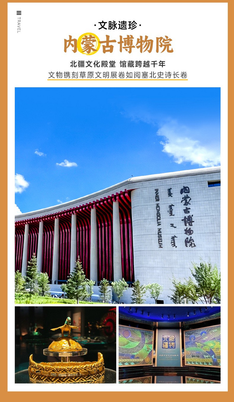 ·【内蒙古博物院】内蒙古自治区蕞大的综合性博物馆,也是全国少数民族地区蕞早建立的博物馆。建筑极具鲜明的民族特色,整体造型现代新颖,与周边环境有机融合,寓意为 “辽阔的草原之上矗立着刻满历史年轮的蒙古包,由幽深的远古时代走向美好的未来”。