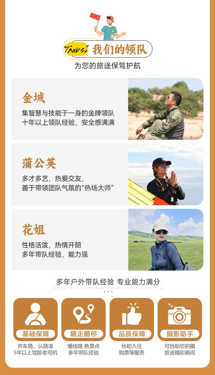 2、以上行程时间及顺序供参考,受天气、交通、景区调控及队员体能等不同影响有可能会调整,以领队实际安排为准;