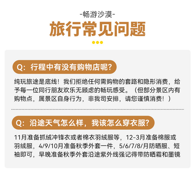 您可以选择乘坐巴士游玩,或者乘坐专业的沙漠越野车进入沙漠深处,体验越野冲沙的刺激,欣赏常人无法触及的美景。
