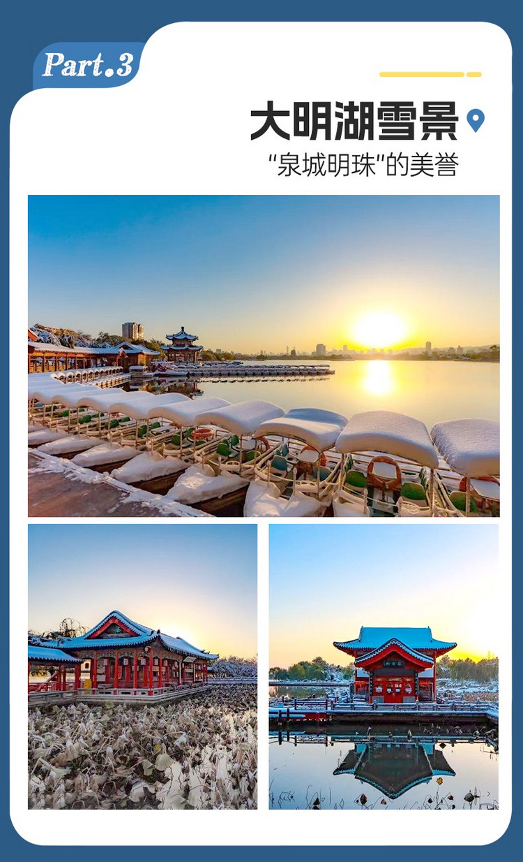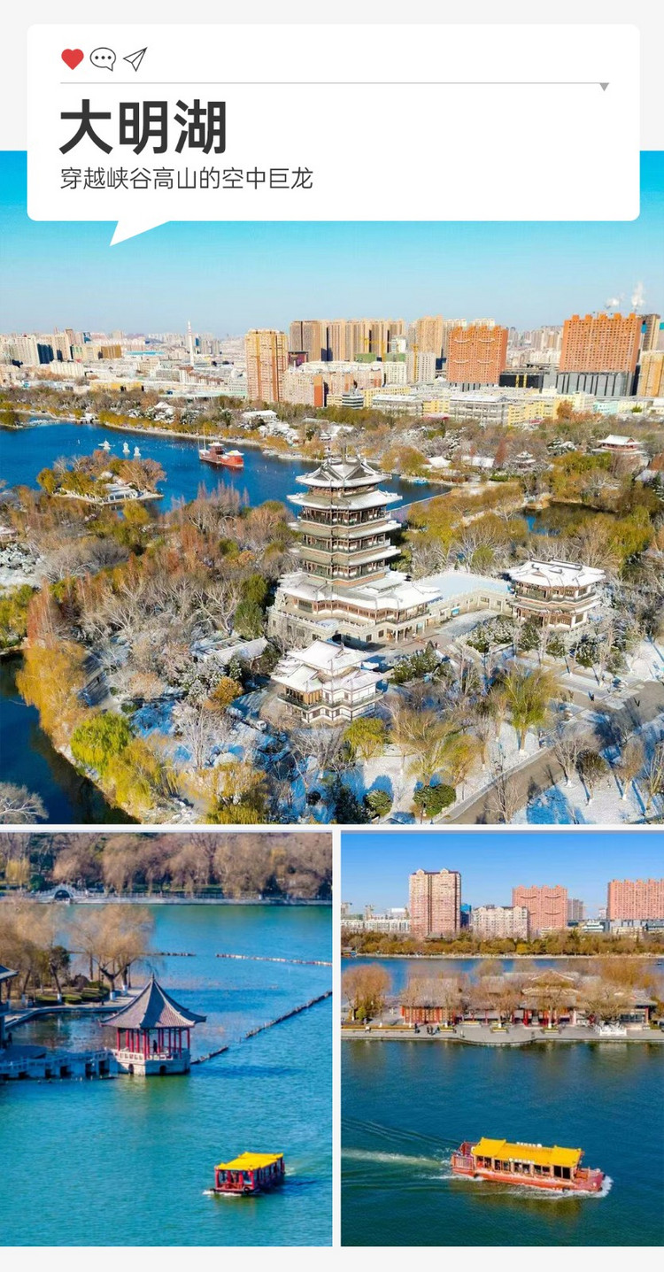 ·【大明湖】位于济南市中心、古城北部,面积 103.74 公顷,是由济南旧城区四大泉群泉水汇流而成的天然湖泊,素有 “泉城明珠” 的美誉。其历史悠久,早在北魏郦道元的《水经注》中就有记载,北宋曾巩任齐州知州时,修堤建桥筑亭,奠定了大明湖的格局
