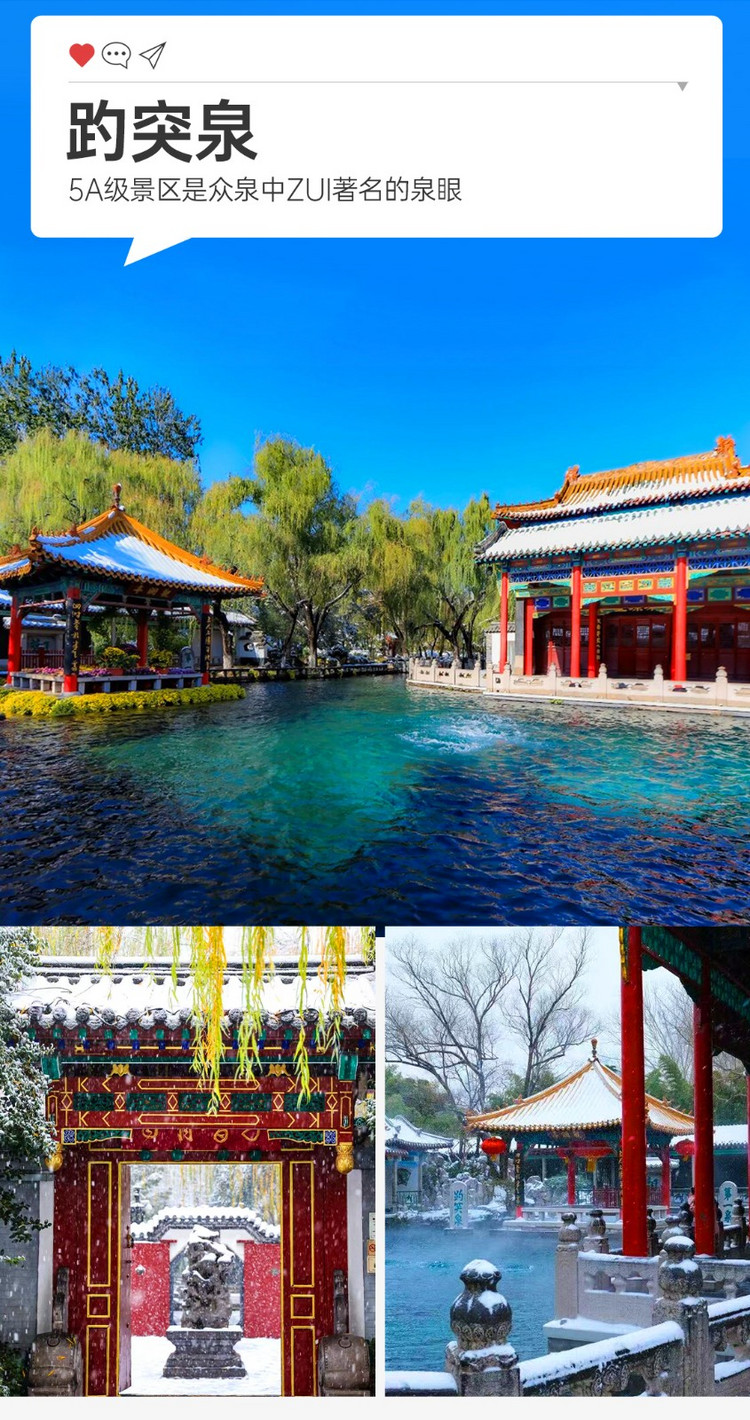 ·【趵突泉】被誉为 “天下第一泉”,是济南 “七十二名泉” 之首,位于济南市历下区趵突泉南路 1 号。乾隆南巡时因其甘冽清甜,亲题 “天下第一泉”。泉水从地下石灰岩洞中喷涌而出,形成三股巨大水柱,昼夜不息,水温恒定,水质清澈。景区内有李清照故居、泺源堂、观澜亭、万竹园等景点,还保留着康熙 “激湍”、乾隆《趵突泉游记》碑等历代文人题刻。