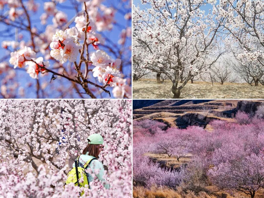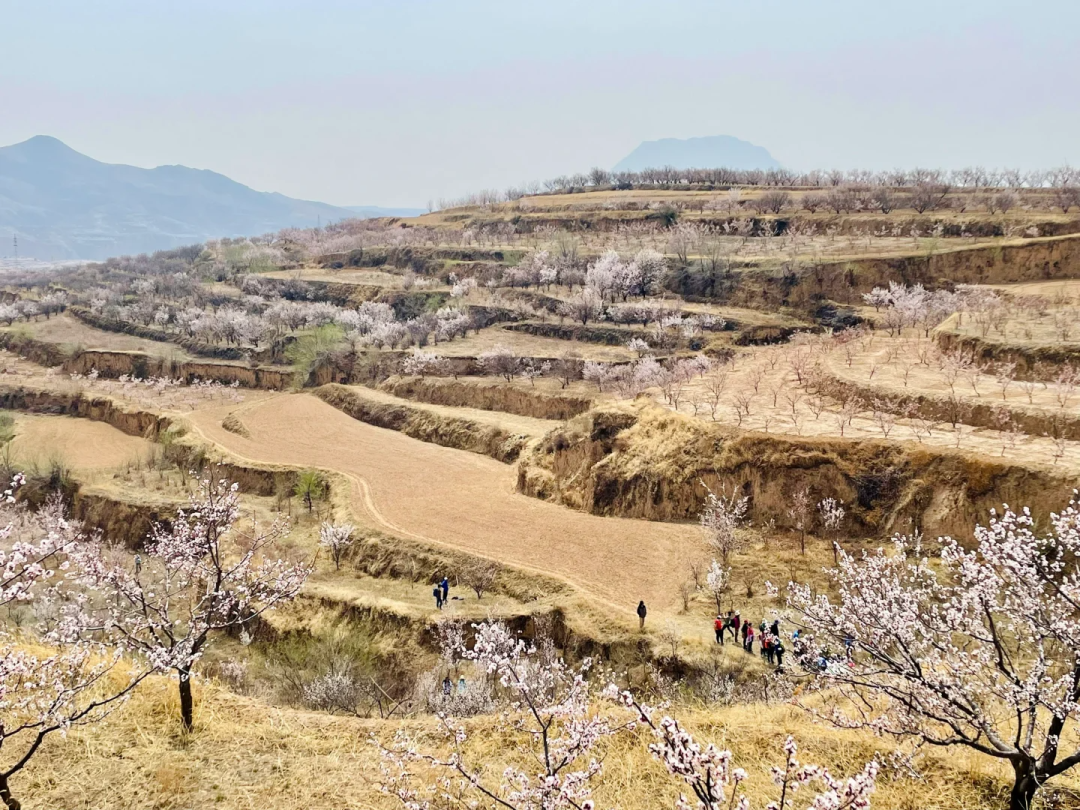 蜿蜒梯田与杏花相映成趣,形成“花在梯田中