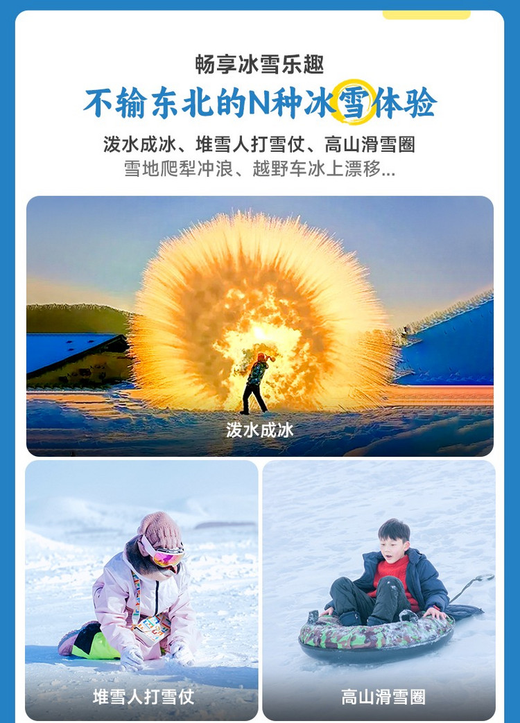 下午前往【塞北雪乡】【白家窝铺】玩雪撒欢。在这里,我们还可以体验泼水成冰,热水的水蒸汽四散开来完全暴露在空气中,在乌兰布统极度低温的状态下,就会形成类似雾状的形态,也可以堆雪人、打雪仗、高山滑雪......多种游玩项目带你找回童年的简单快乐!