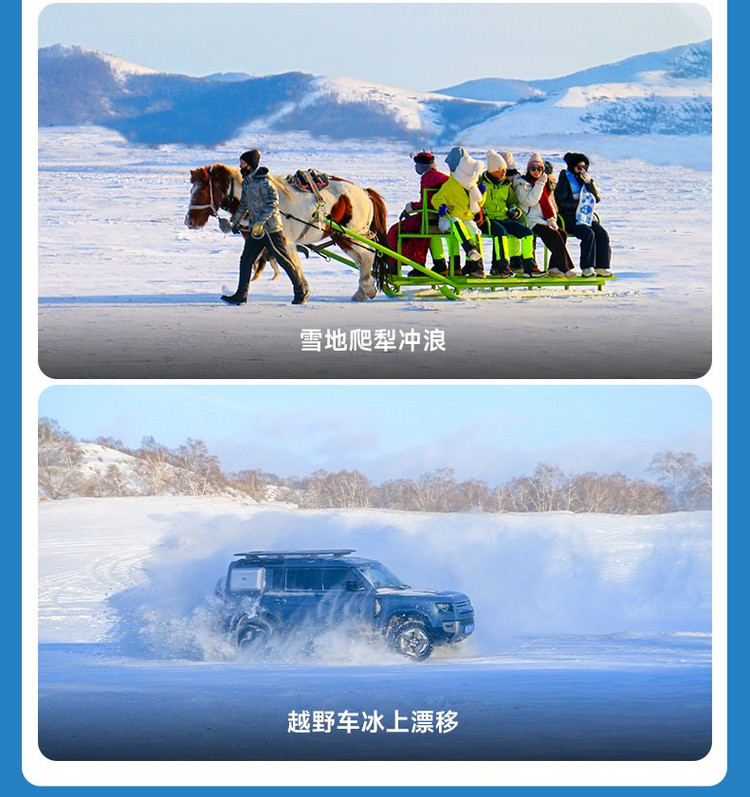 早餐后,我们前往【滦河第一湖】,体验刺激满满的越野车冰上漂移,冰上越野串串烧和滑冰车。越野车拉动雪圈,在雪地上呼啸而奔,体验真正的速度与激情。我们可以大声尖叫,在此刻的疯狂中放松身心,感受最纯粹的畅快!