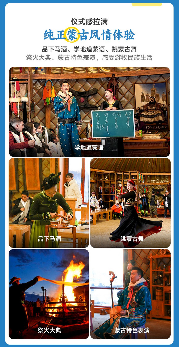 午餐后,我们到达【游牧体验园】,在这里可以放肆开玩,体验雪地爬犁冲浪、高山滑雪圈,参加蒙古族祭火大典,在暖喝的蒙古包内与热情蒙古人学蒙语、跳蒙古舞,观看群狼夺肉、马头琴表演,喂食草原精灵梅花鹿,品尝下马酒、奶皮子、奶豆腐,全方位感受蒙古族风情。