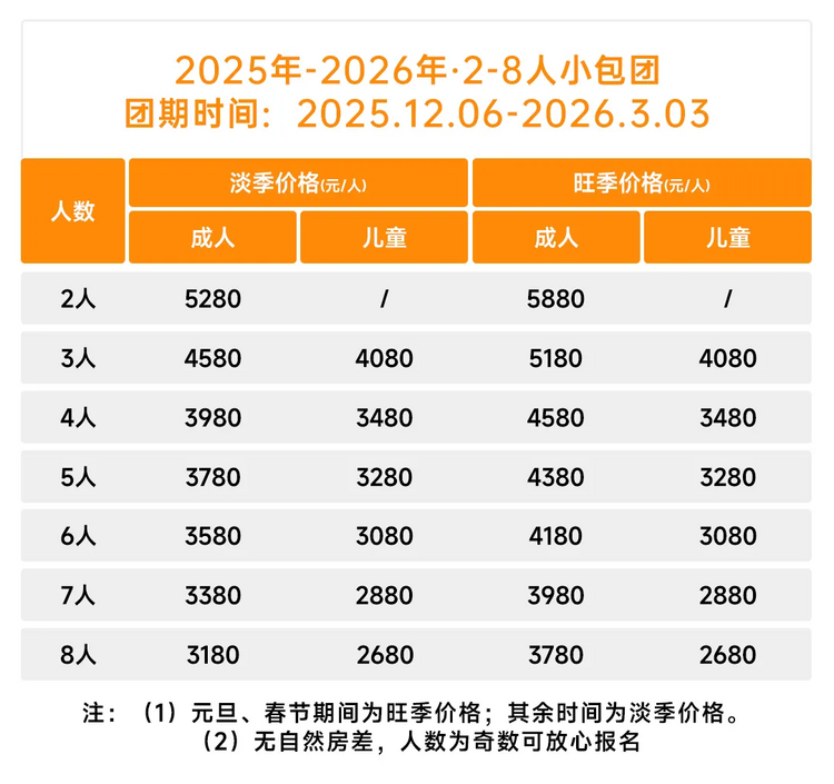 全程入住标间(一个房间两个床位)单个报名的,由领队安排同性拼房,如不愿拼房,需补交单房差,平日单房差500元/人,节假日单房差700元/人。(不要求单独住宿,拼房不成的,单房差由俱乐部承担,请单个报名的伙伴放心报名。)