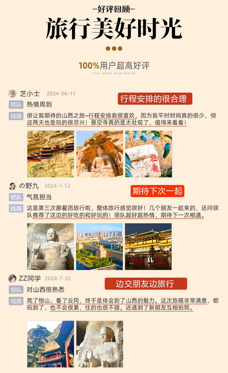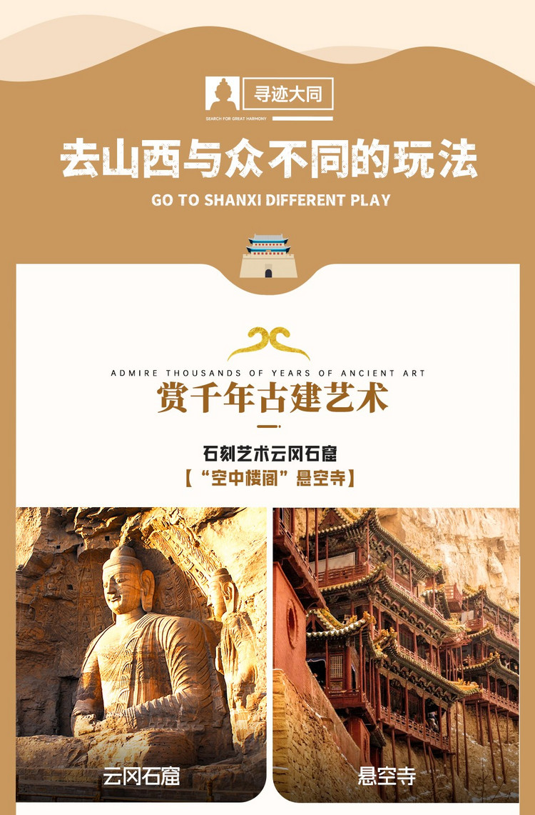 1、门票:云冈石窟100元,恒山45元+景交车20元,悬空寺15元(景区门票无团队优惠,需自行实名制预定,云冈石窟购买第一天下午,恒山及悬空寺购买第二天上午);