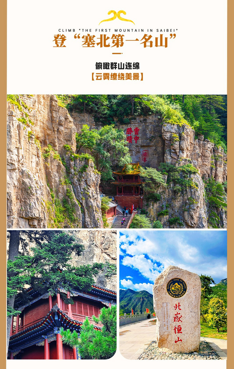 随后我们游览【恒山】。恒山庙宇集中,拥有“三寺四祠九亭阁,七宫八洞十五庙”的庞大建筑群,是重要的道教发祥地,相传“八仙”之一的张果老就是在此修行得道~恒山自然景观独特,攀登恒山东西两峰的天峰岭、翠屏峰,一路可欣赏山石峭崖之胜景。登至顶峰,更可观云海之奇观。遍布的奇花异草更是形成四季皆美的自然风光,春天山桃烂漫、夏天绿林笼罩、秋天层林尽染、冬临银装素裹,徜徉于此养眼、养肺,更能收获惬意好心情!