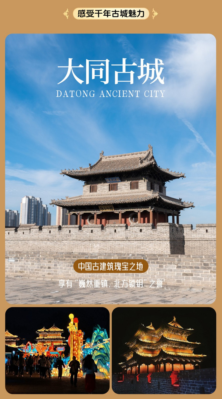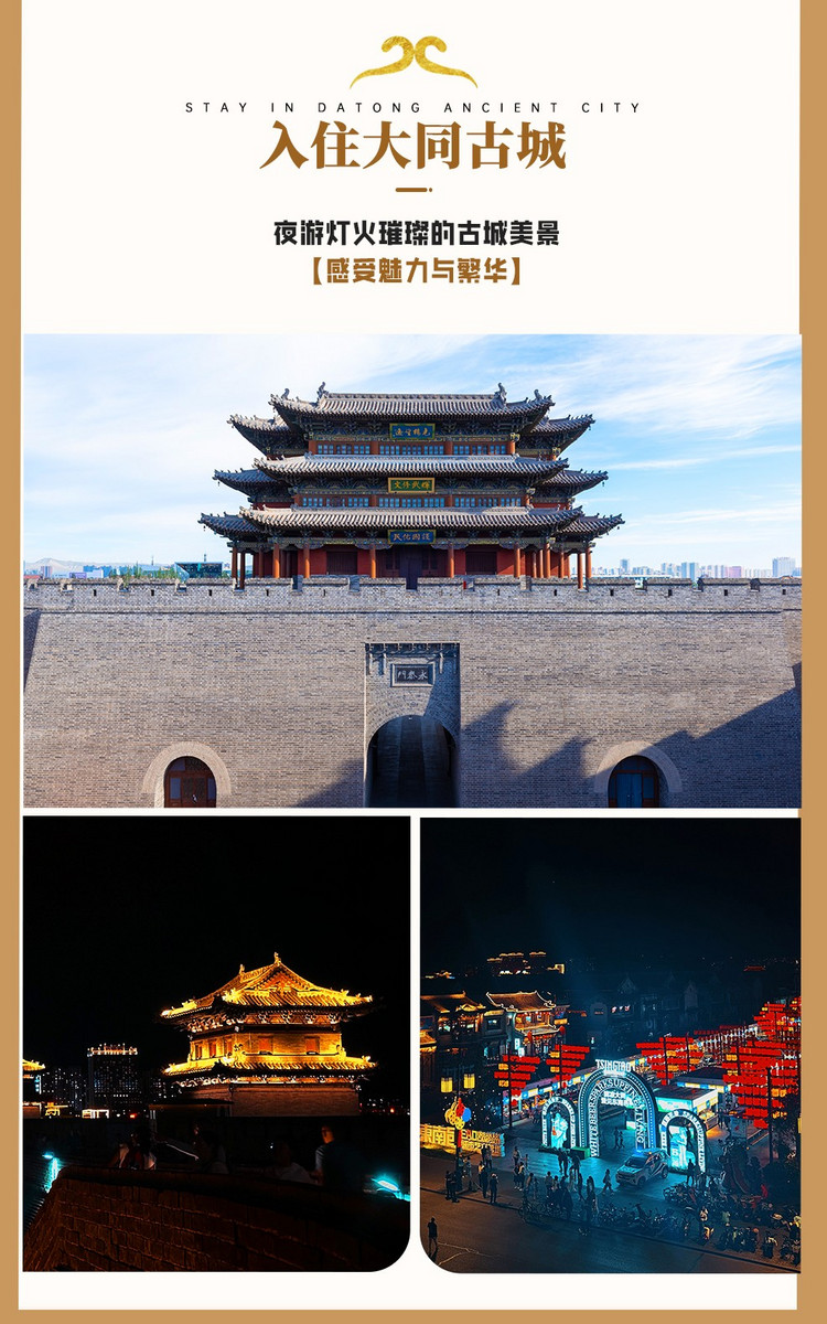 晚上可前往大同古城游玩,古城始建于宋朝,是我国古代军事建筑史上颇具特色的重镇名城,号称“金汤之城”。这里百步一寺,百步一庙,更有四牌楼、钟楼、鼓楼,四条大街、八条小巷、七十二条绵绵巷各具特色,还有多处古建筑和四合院,令人无限向往。特别是入夜时分,古城墙上华灯璀璨,城市主干道上条条灯河流光溢彩。整座城市笼罩在一片月色和灯光之中,让大同成了火树银花的不夜城,美不胜收,行走其间有一种童话般的感觉~