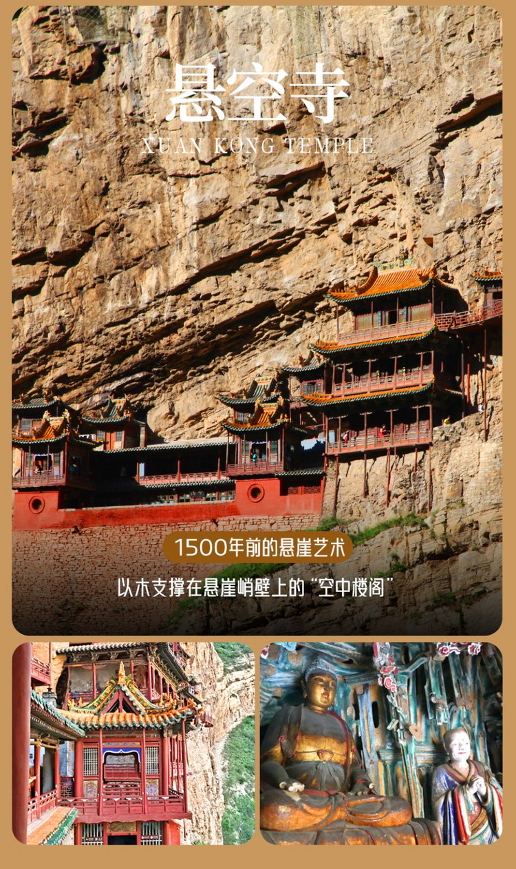 上午游览世界岌岌可危十大建筑之一的【悬空寺】(游览时间约40分钟)。素有“悬空寺,半天高,三根马尾空中吊”的俗语形容的悬空寺,距今已有1500多年历史,是国内现存的唯一的佛、道、儒三教合一的独特寺庙,也是国内现存较早、保存较完好的高空木构摩崖建筑,殿琮楼阁40余,依靠榫接结构,嵌入崖内而不倒,诗仙李白观后醉书“壮观”,徐霞客赞为“天下巨观”。穿行其中,脚下是陡峭险峻的台阶,旁侧是近百尺的悬崖,会顿感肾上腺激素飙升,痛快刺激。我们在这里尽情拍照,揭开神秘悬空寺的真实面纱~