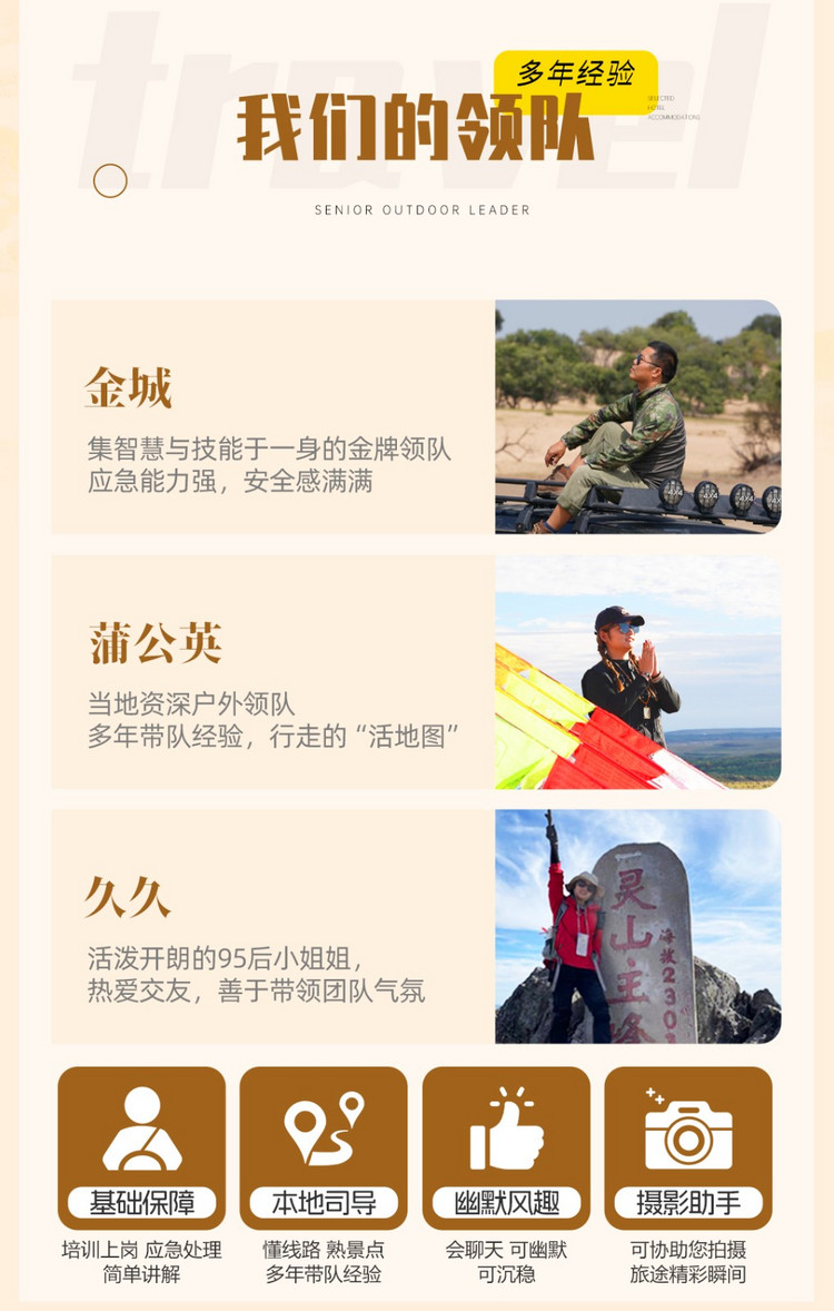 注:以上行程时间及顺序供参考,受天气、交通、景区调控及队员体能等不同影响有可能会调整,以领队实际安排为准。