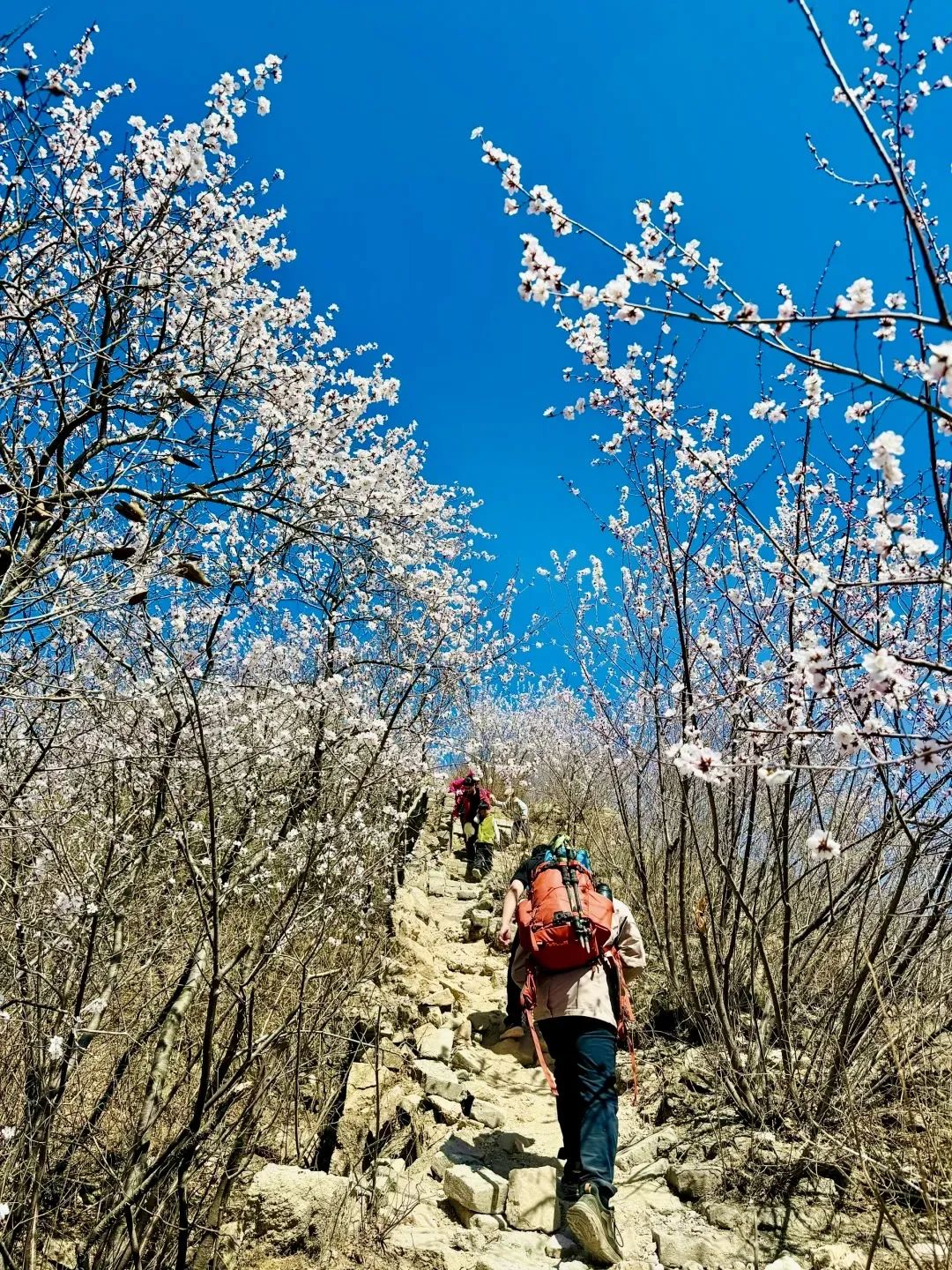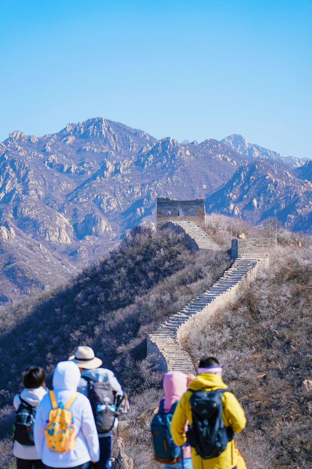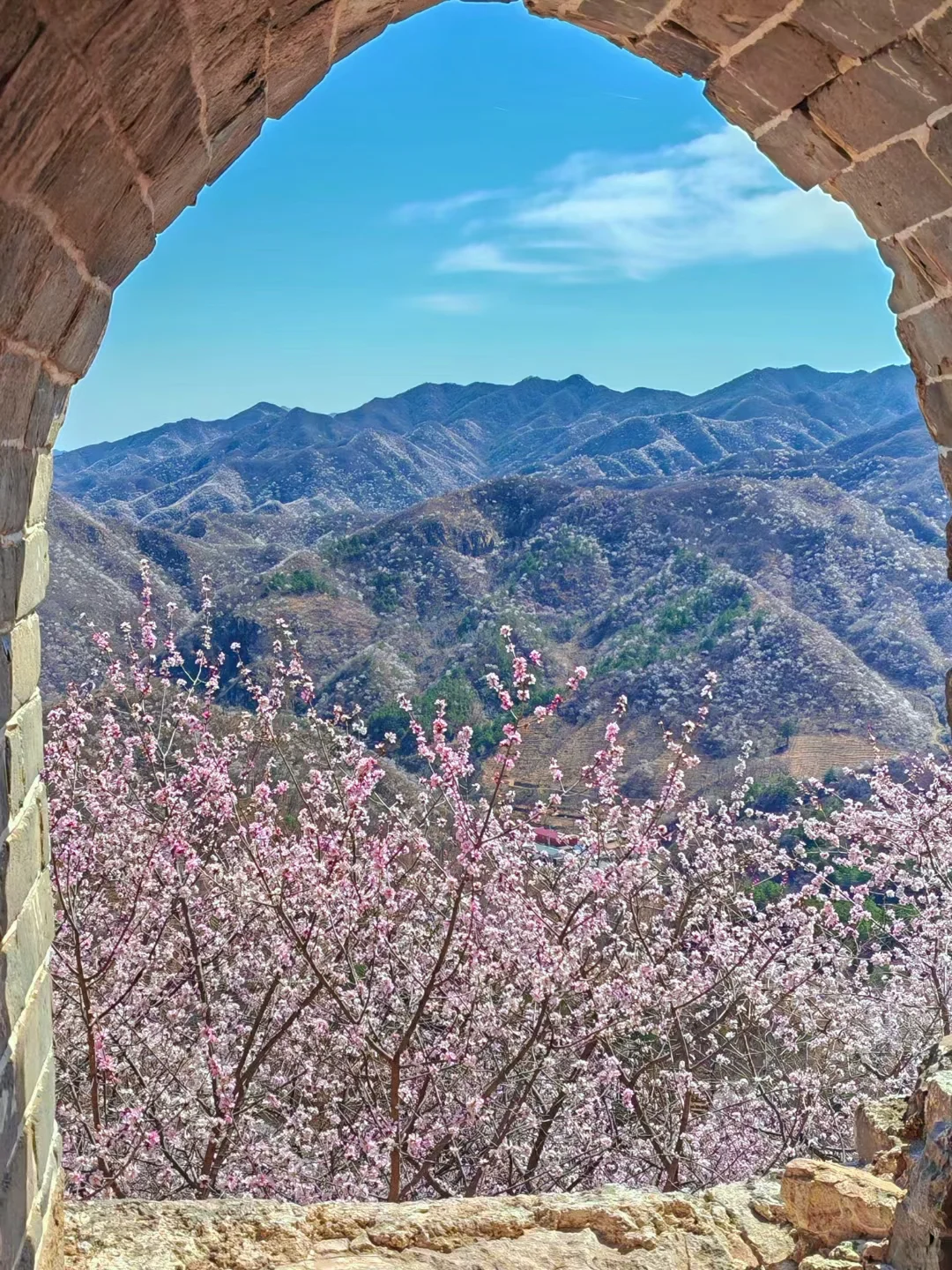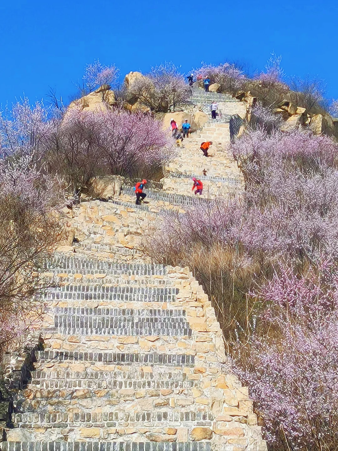 龙泉峪野长城绵延于崇山峻岭之上,一直延伸到远方,两侧大山上开满山桃花和杏花。满山遍野的山桃花摇曳生姿,就像上帝之手撒了一把花种子,在春风里发芽绽放。而古长城在山花和蓝天印衬下,不再显得那么苍凉悲壮,更加的神采奕奕,魅力四射。