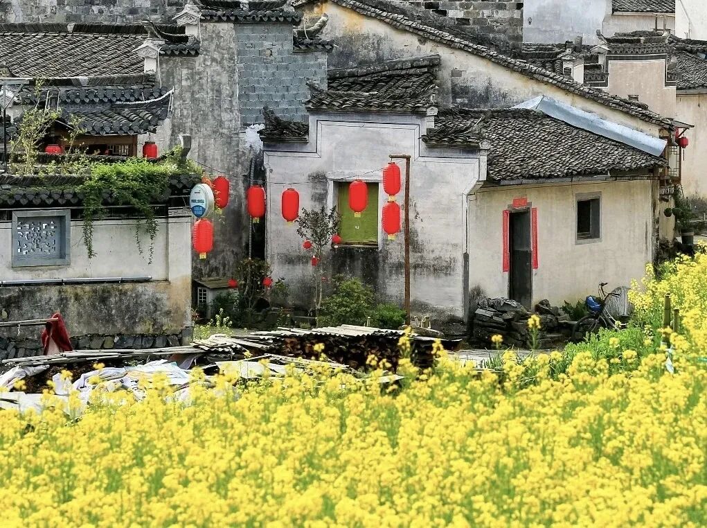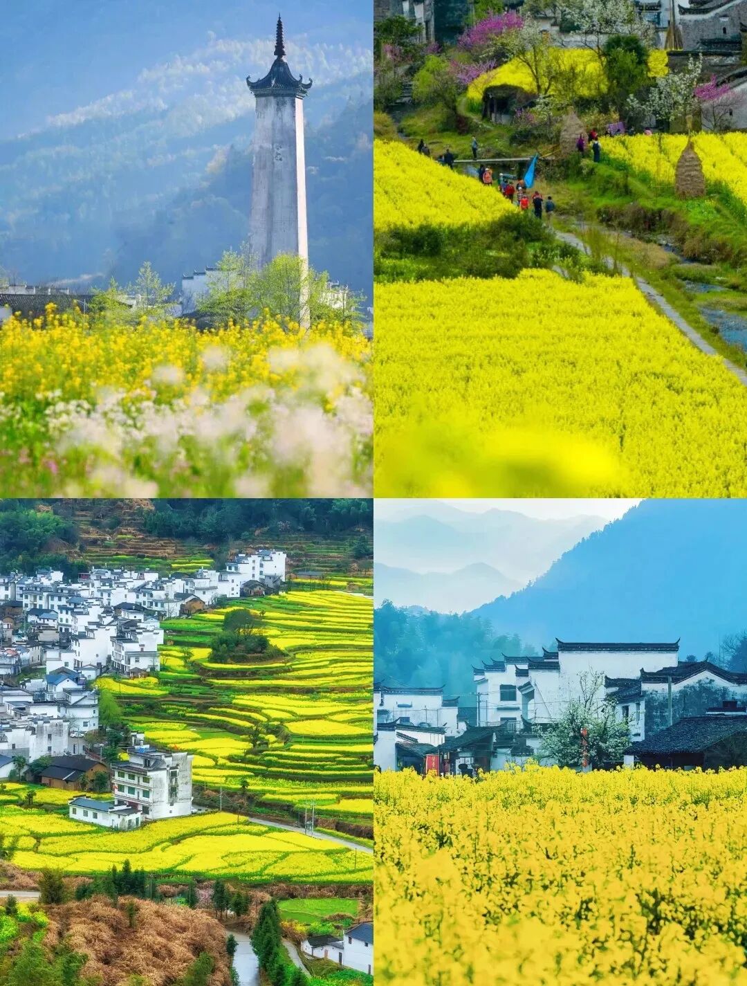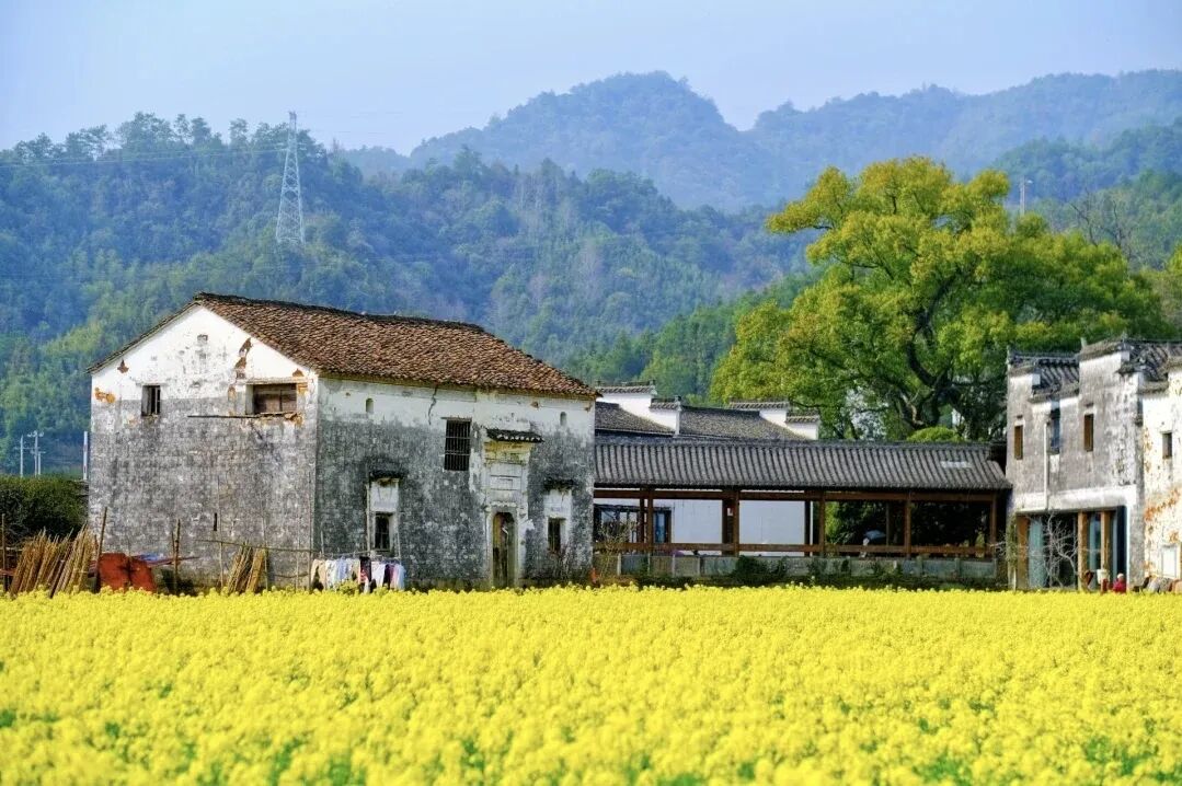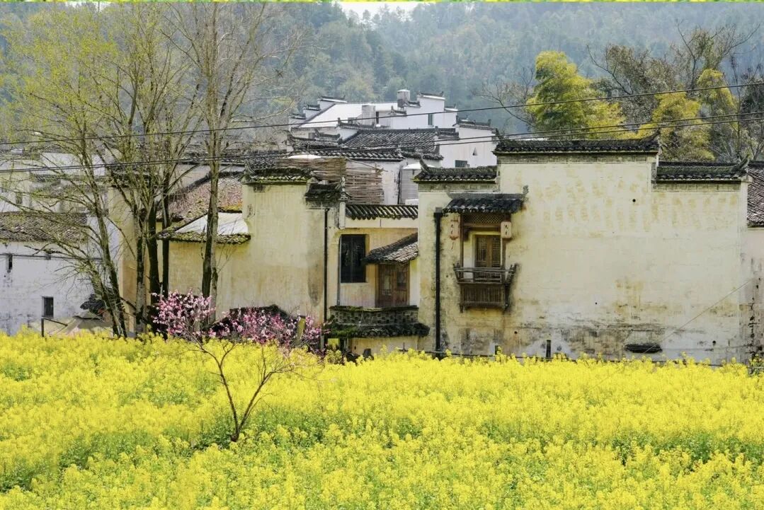 黄灿灿的油菜花与远山、近水、粉墙、黛瓦相映成趣