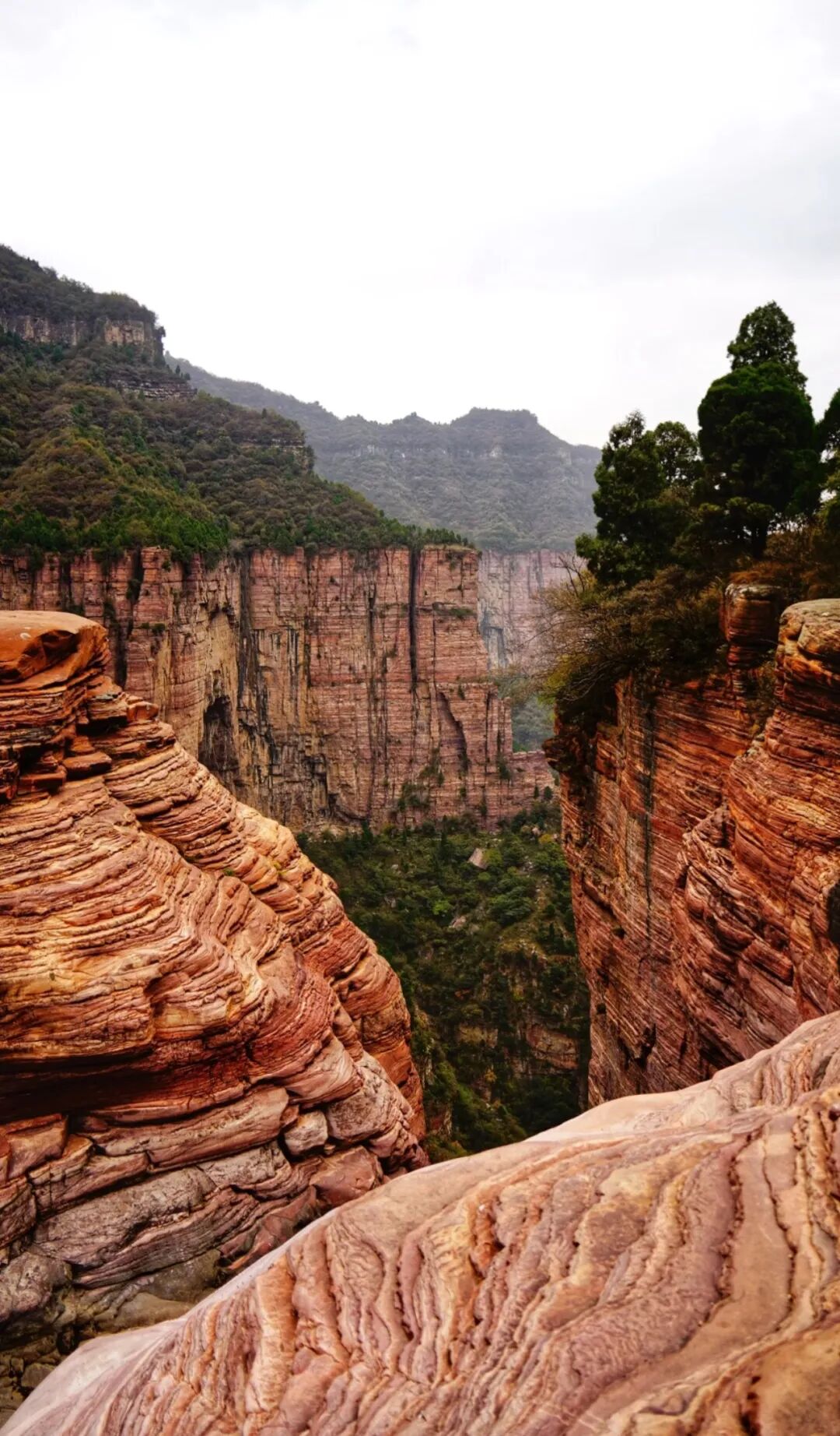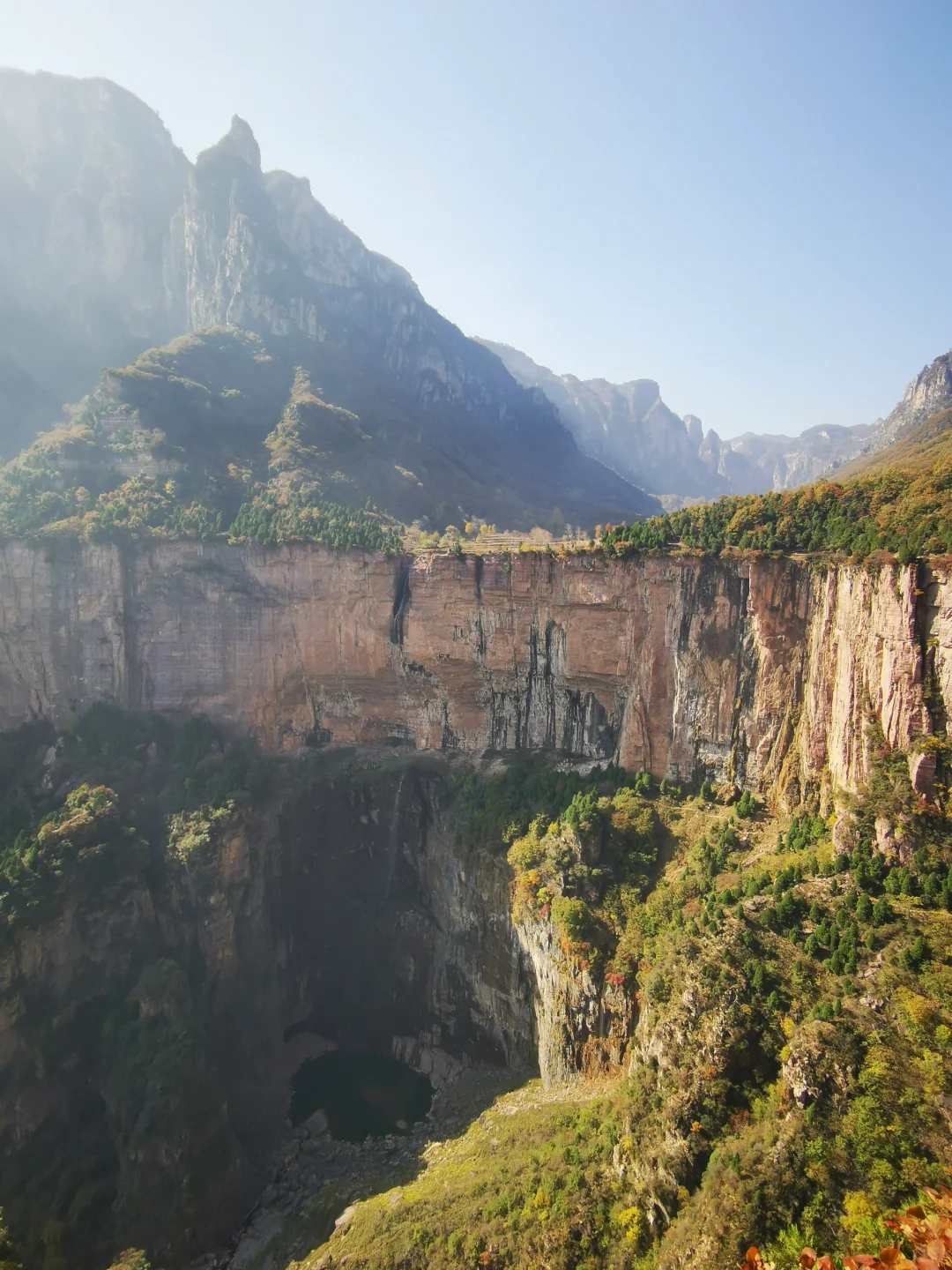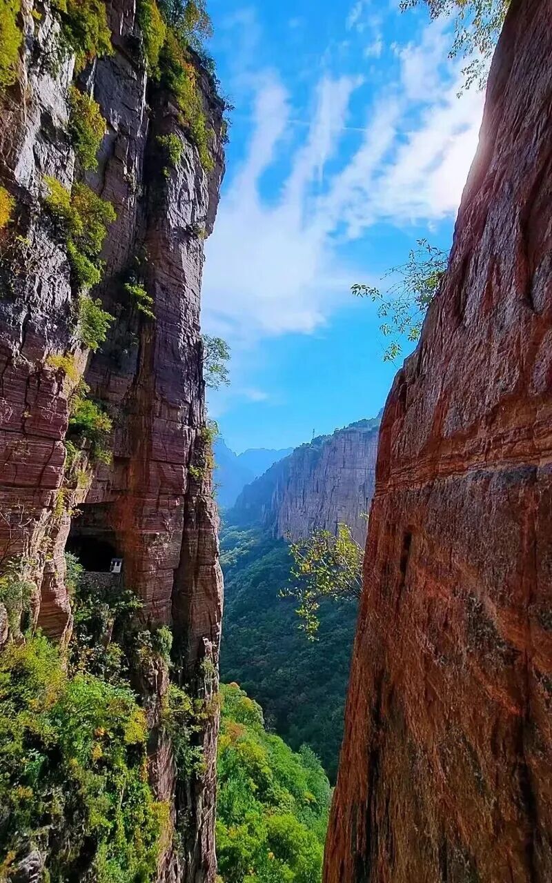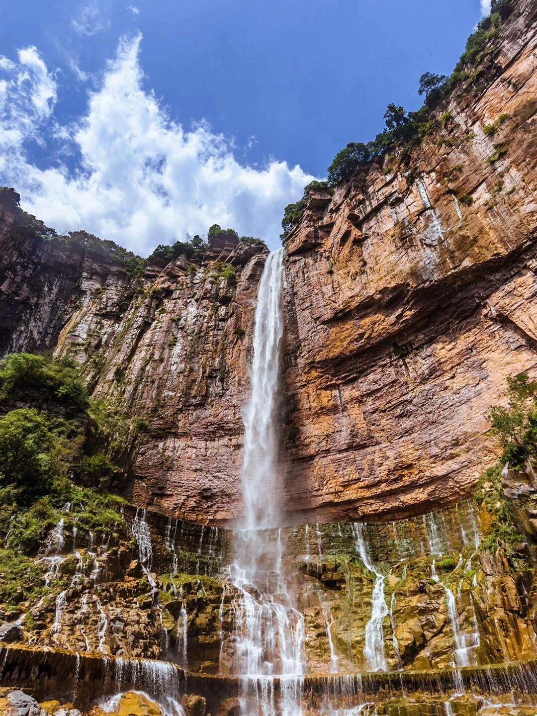 抱犊大峡谷上方是老龙口一个网红之地,被称为中国的羚羊谷,这里红色石英岩绝冠太行,太行山在这里突然断裂下去,形成一个落差近300米,长上百公里的断裂带,成片的红色石英岩,经过千万年水流侵蚀和风化,在断崖上开了一个大裂口,雨季上游的来水通过裂口呼啸而下。