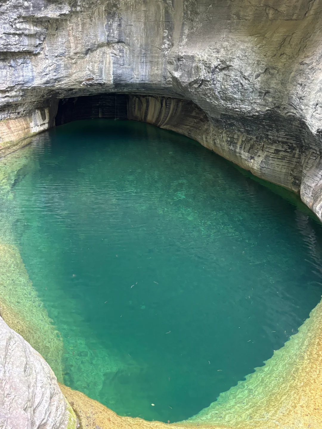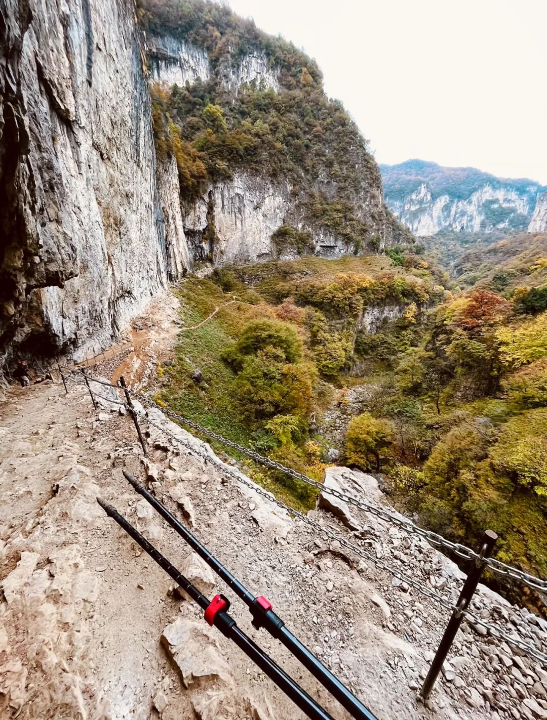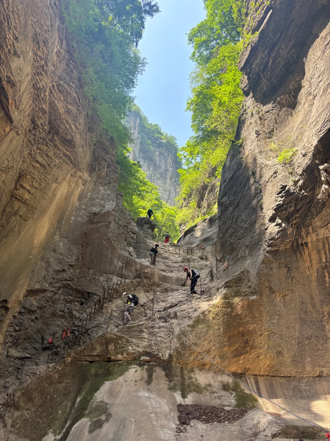 之后进入抱犊大峡谷,这条路极为险峻秀美,途经一线天是马武寨通往抱犊村的道路,一线天是整个抱犊峡谷最危险的地方, 有三个断崖,连着三次三个十米左右的下降,近80度的坡度,每到下面正好是墨绿的深潭,更让人不寒而栗。潭水不知有多深。原来仅靠石壁上凿出的窝坎攀行,现在虽然固定了铁链保护,但行走其间,仍旧是胆战心惊;
