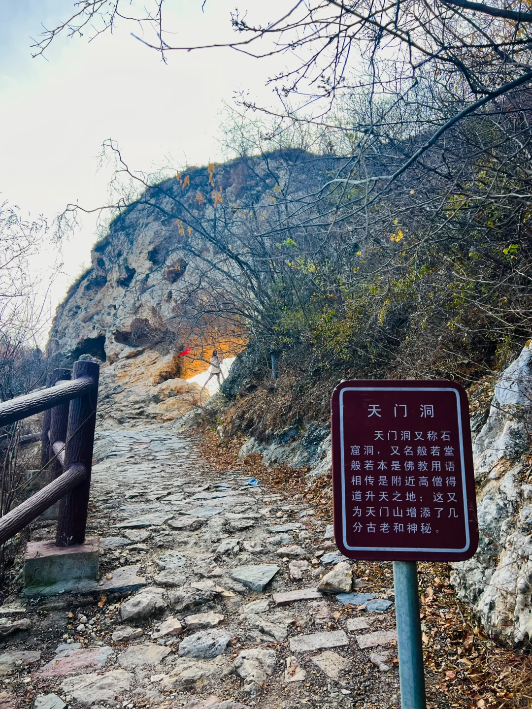 #天门山位于门头沟区潭柘寺镇南辛房村,紧邻“千年古刹”潭柘寺,距离市中心40公里。因山顶悬崖自然形成不规则的透天窟窿,百姓称之为窟窿山,又因其形如“门”,石窟内壁有“天门山”字样石刻而得名天门山。