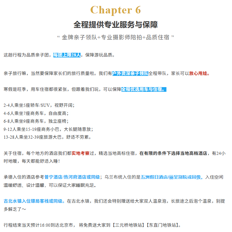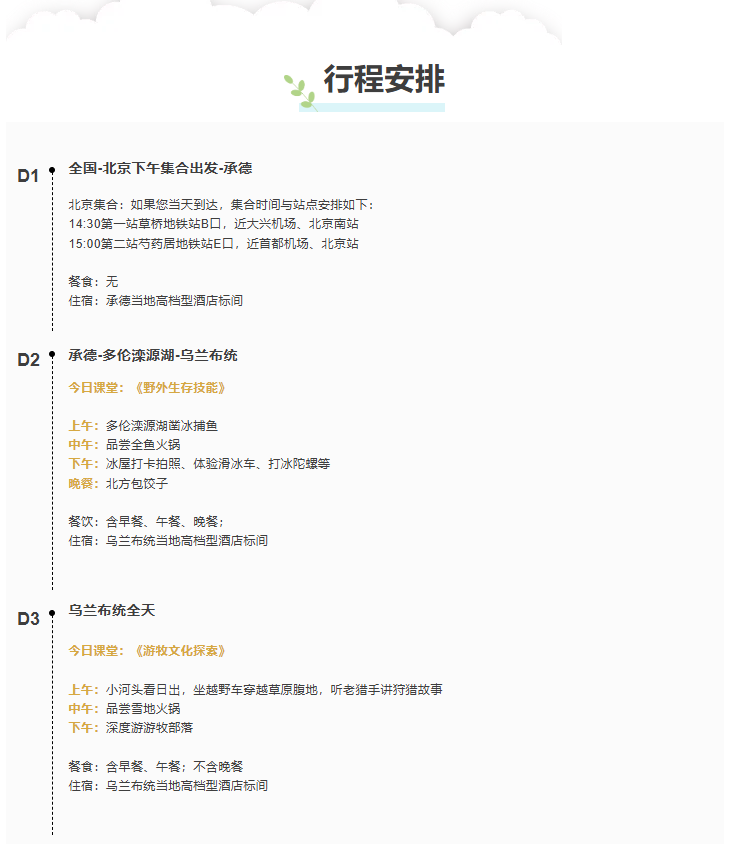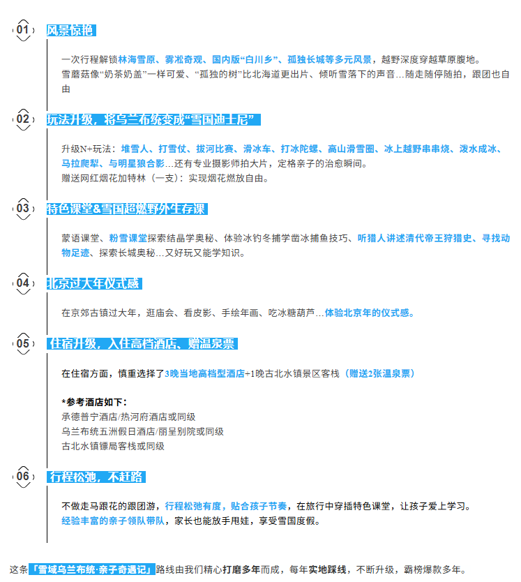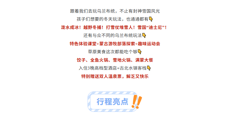 拒绝传统跟团游的走马观花,每天合理安排行程,深入雪原秘境,兼具美景与游玩游学体验,亲子家庭都放心冲!!!