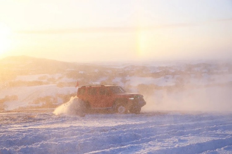 越野车拉着一排小宝贝在雪地上漂移,