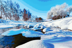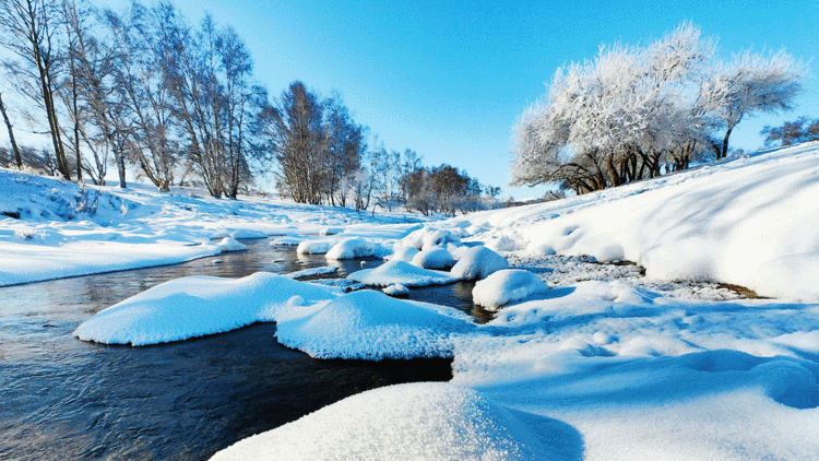 河流中有着晶莹剔透的冰花,冬日的早晨雾气弥漫在河流上,枝头挂满雾凇。