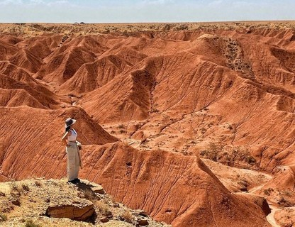 早餐后我们出发前往【大红山】(车程约3.5小时),一路沿着草原戈壁无人区前行,目光所及,一望无际。
