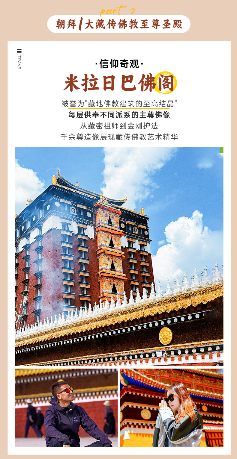 餐后,我们集合乘车前往安多合作【米拉日巴佛阁】(行程约:230KM,车程约3小时,游玩约1小时),佛阁共有9层,每一层都是一个单独的佛堂,每一层代表着不同的教派,供奉的主尊均不相同。所以又名“九层佛阁”,是为藏传佛教白教的代表建筑,为纪念米拉日巴而修建的佛阁。米拉日巴是藏传佛教史上最富传奇色彩的一位大师,是噶举派(白教)创教者之一。外观宏伟,色彩浓烈,内部金碧辉煌,绘满了壁画,阁外设有转经筒。在整个藏区共有两座米拉日巴佛阁,合作的这座便是其中之一。