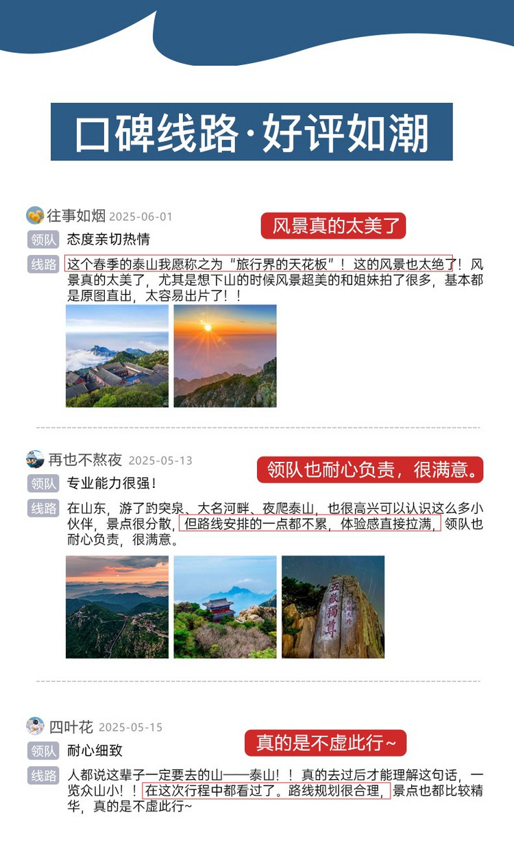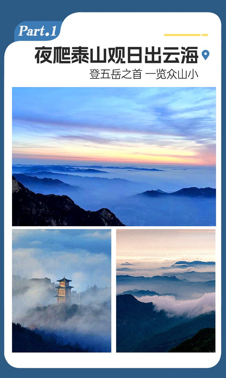 3、门票:请在“泰山景区”微信公众号完成线上实名制要预定出行日当天门票,泰山景区提前7天放票,报名后请尽快预约泰山门票!(泰山门票个人实名制预定,无法订购团队票,如有变化,门票可全额退款)