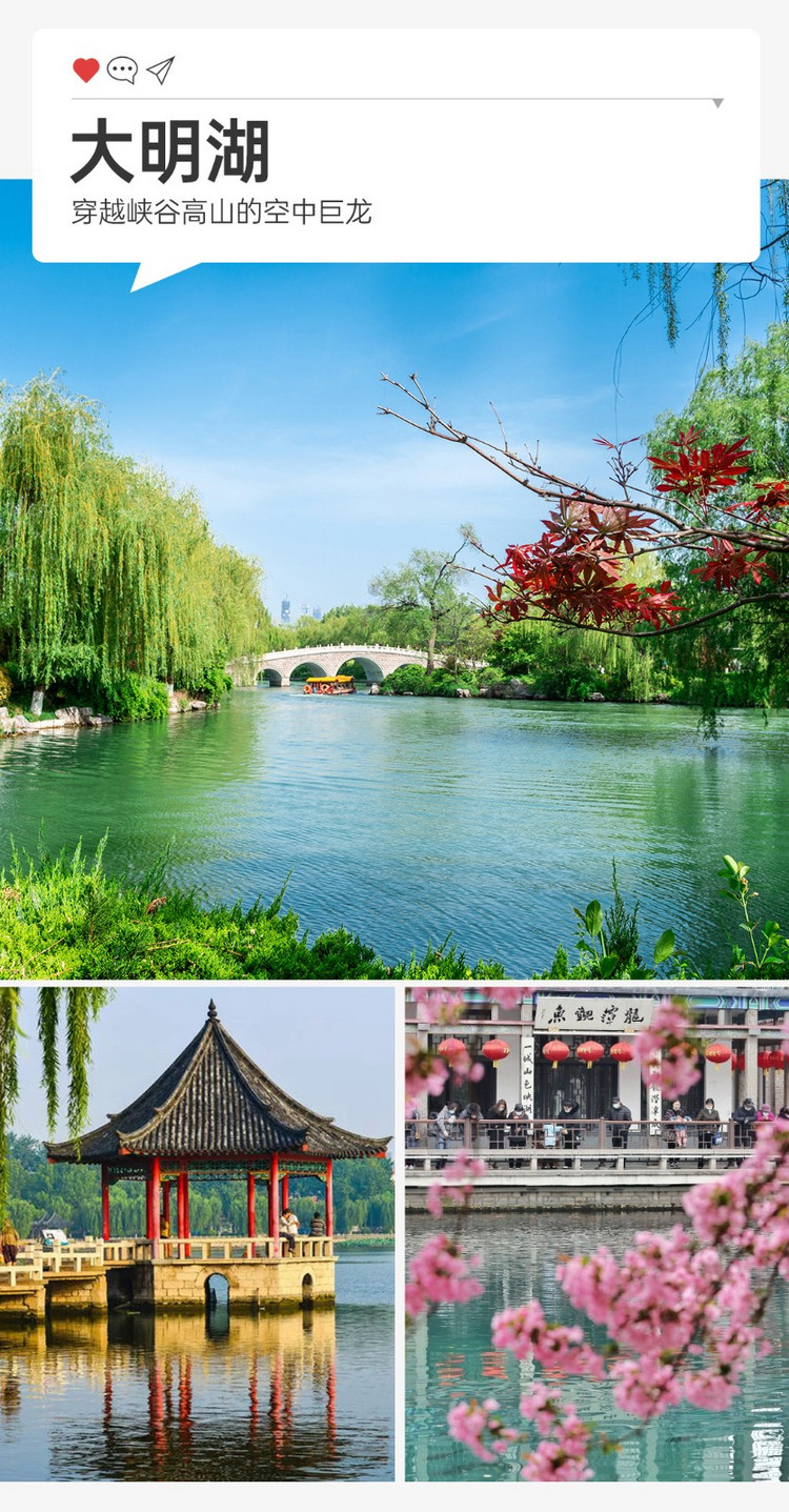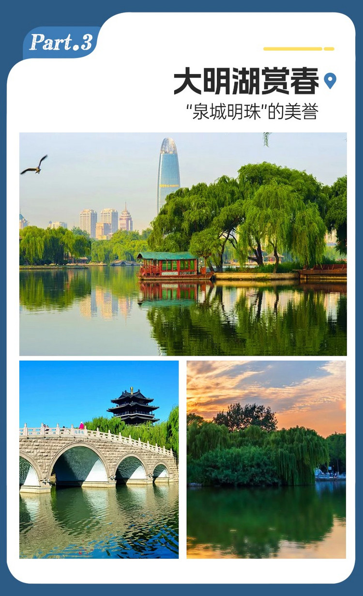 ·【大明湖】位于济南市中心、古城北部,面积 103.74 公顷,是由济南旧城区四大泉群泉水汇流而成的天然湖泊,素有 “泉城明珠” 的美誉。其历史悠久,早在北魏郦道元的《水经注》中就有记载,北宋曾巩任齐州知州时,修堤建桥筑亭,奠定了大明湖的格局