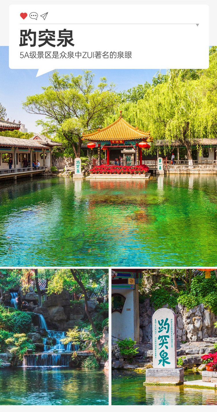 ·【趵突泉】被誉为 “天下第一泉”,是济南 “七十二名泉” 之首,位于济南市历下区趵突泉南路 1 号。乾隆南巡时因其甘冽清甜,亲题 “天下第一泉”。泉水从地下石灰岩洞中喷涌而出,形成三股巨大水柱,昼夜不息,水温恒定,水质清澈。景区内有李清照故居、泺源堂、观澜亭、万竹园等景点,还保留着康熙 “激湍”、乾隆《趵突泉游记》碑等历代文人题刻。